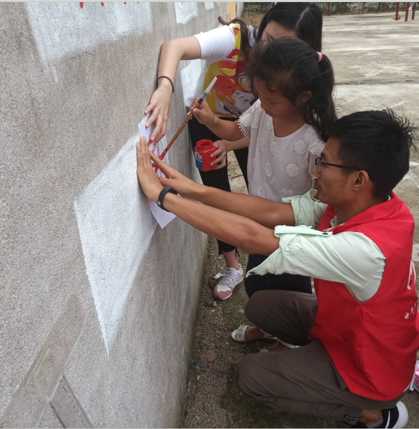 “文化服务”乡村振兴小分队的同学们则通过墙体彩绘向孩子们讲述社会主义核心价值观和中国梦的内涵,并邀请他们一起加入到墙绘活动中来,深受小朋友和村民的好评。