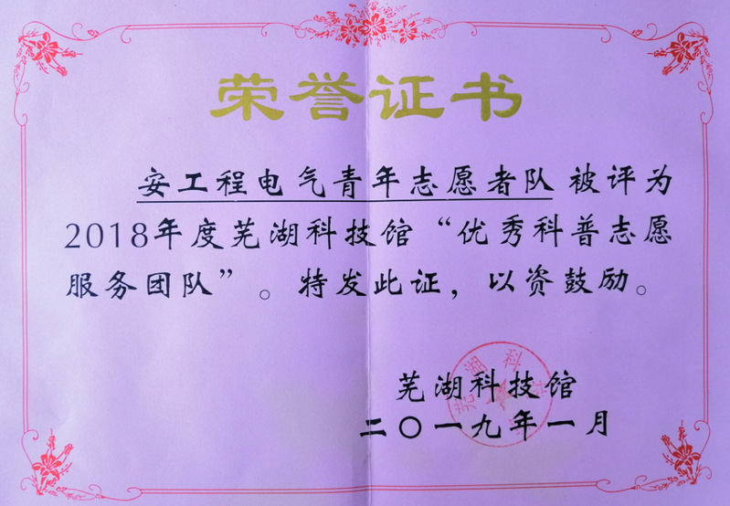 jav 青年志愿者队荣获芜湖科技馆2018年“优秀科普志愿服务团队”荣誉称号