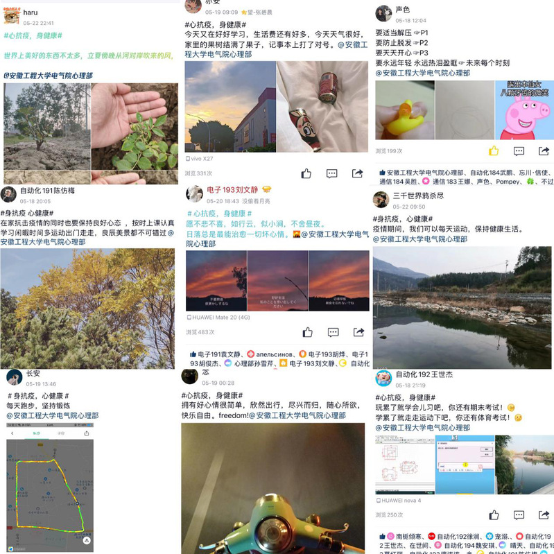 本次心理健康月活动是在疫情背景下线上组织开展的,同学们积极参与,分享他们宅家的快乐生活,进一步增强大学生心理健康意识,提高了学生情绪管理和心理疏导等能力。