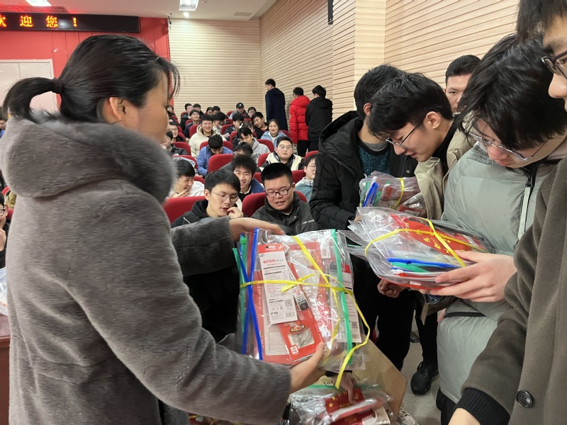 与会老师为考研同学发放了考试文具慰问物品。自动化183吴雪同学说,在考研冲刺的寒冬里收到这份饱含殷切期盼、纸短情长的“爱心文具袋”,内心十分温暖,接下来一定积极备考,坚持到底,不负学院领导老师期望,为学院添彩。