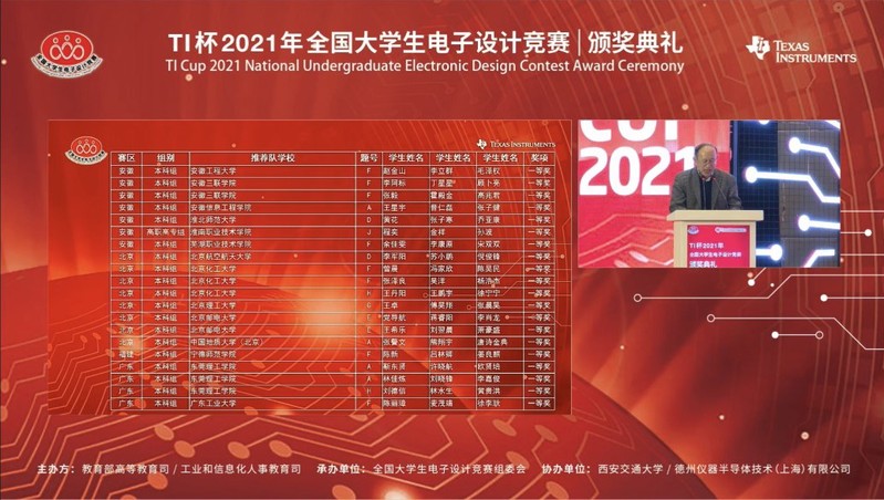 TI杯全国大学生电子设计竞赛是教育部、工业和信息化部共同发起的全国影响力最高、规模最大的专业学科竞赛之一。TI杯2021年全国大学生电子设计竞赛于11月4日正式启动,来自全国1117所院校,19735个学生队伍,共计近6万名大学生报名参加比赛。其中322个参赛团队获全国一等奖(获奖比例1.6%),790个参赛团队获全国二等奖(获奖比例4%)。12月9日,TI杯2021年全国大学生电子设计竞赛颁奖典礼在西安交通大学举行。