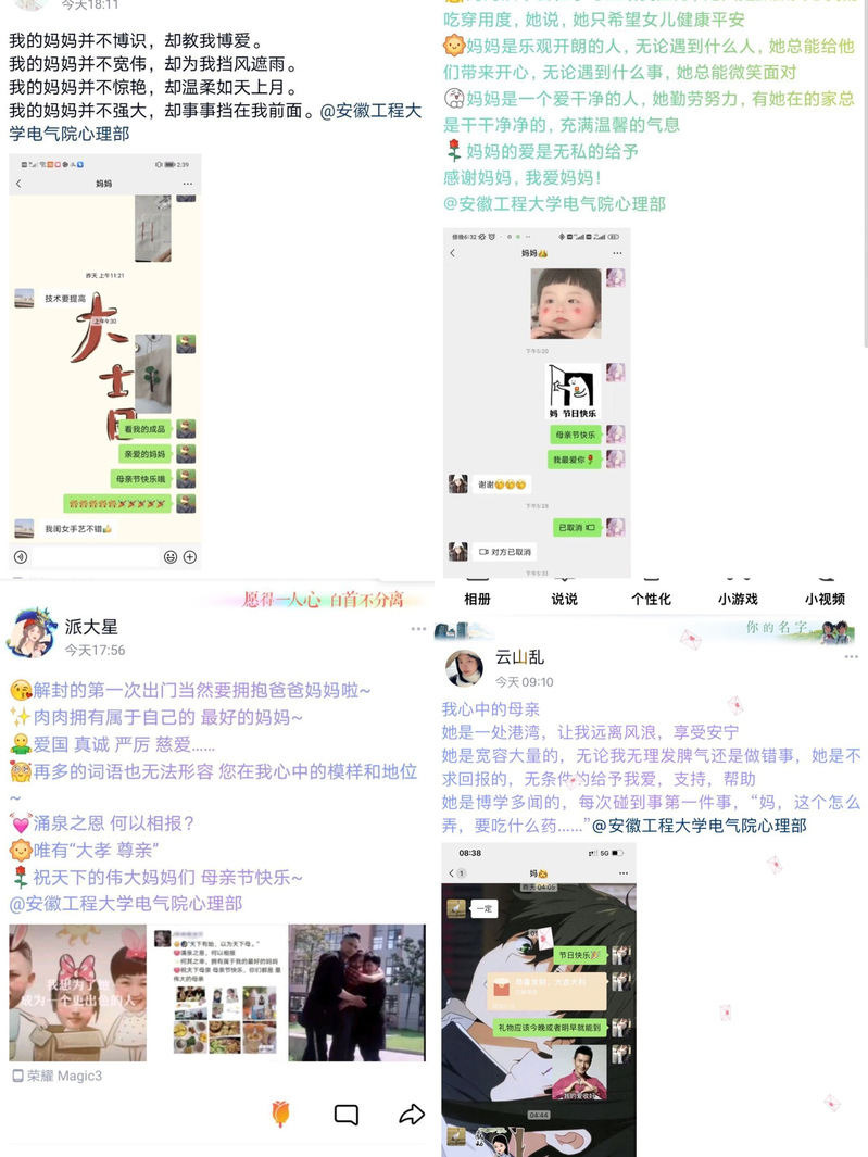 “萱草生堂阶,游子行天涯。慈母倚堂门,不见萱草花”。5月8日母亲节当天,“感恩生命,感谢母亲”QQ空间线上作品提交活动的开展,吸引了校本部和国际工程师学院校区100余名学生的参与。在收到的作品中,通信202洪心睿表示,“不求母亲给自己最好的,只希望母亲健健康康,少一份操劳,多一份喜悦,愿时光待她温柔点,白发和皱纹少一点”。电子211林佳钰表示,“母亲总是‘刀子嘴豆腐心’,但我知道这是最好的爱”。每位参与者将内心对母亲的爱通过网络平台表达出来,或含蓄问候,或直接祝福。