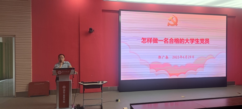 郭广春从领学《中国共产党章程》开始,提出广大青年党员需从牢记党员身份,践行初心使命,做好眼前当下,成为先锋模范这四个方面加强自身道德修养,努力提高综合素质。他用大量的鲜活案例告知当代青年“要用伟大梦想来固牢信仰,没有梦想的人就如同迷失的羔羊,很容易迷失方向,甚至与党的最高理想和最终目标渐行渐远。”他要求广大学生党员要始终牢记自己党员身份,时刻谨记习近平总书记对青年的嘱托,立足新时代新阶段,敢于坚持真理,善于独立思考,坚持求真务实,并努力增长才干,成为忠诚且有担当的中共党员。