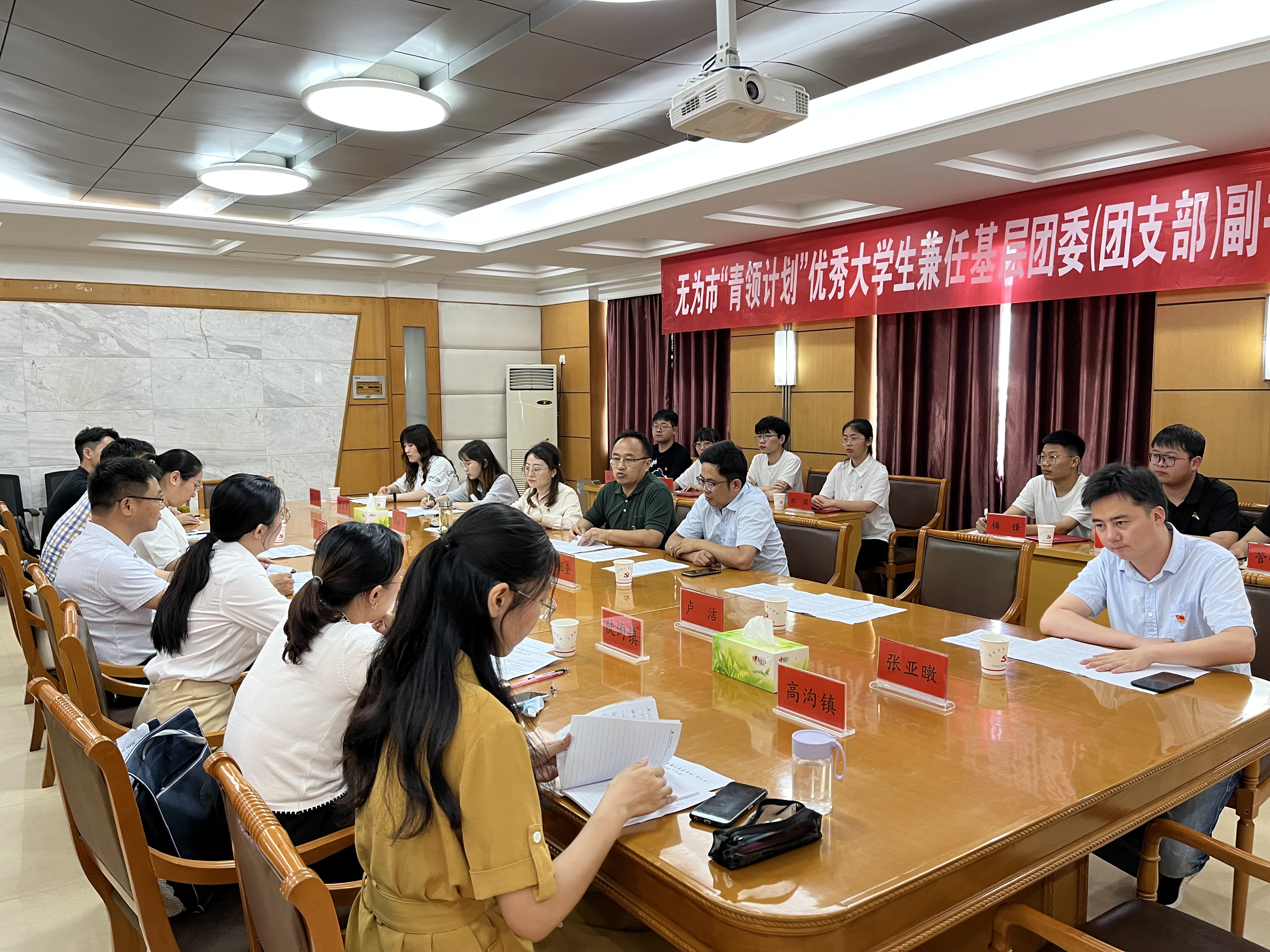 6月30日, jav 与无为市团委在无为市政府会议室举行“青领计划”启动仪式。团芜湖市委副书记谢翔宇,无为市组织部部长陈兆强,校团委书记郭广春、学院党委副书记李恒奎、学院和无为市团委有关同志以及选聘的7名优秀大学生出席仪式。