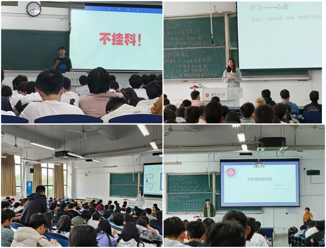 六位毕业生代表通过精美的PPT依次向同学们分享了自己的上岸心得与成功经验,以自身考研或就业经历为例,从大学的阶段性规划、信息收集、目标定位、学习方法、比赛活动、评奖评优等方面作了生动而详实的说明。随着现场气氛的愈发热烈,参会三百多名学子的思绪也逐渐被学长学姐们描摹的未来所吸引,大家纷纷起身发言,积极向学长学姐们咨询请教。