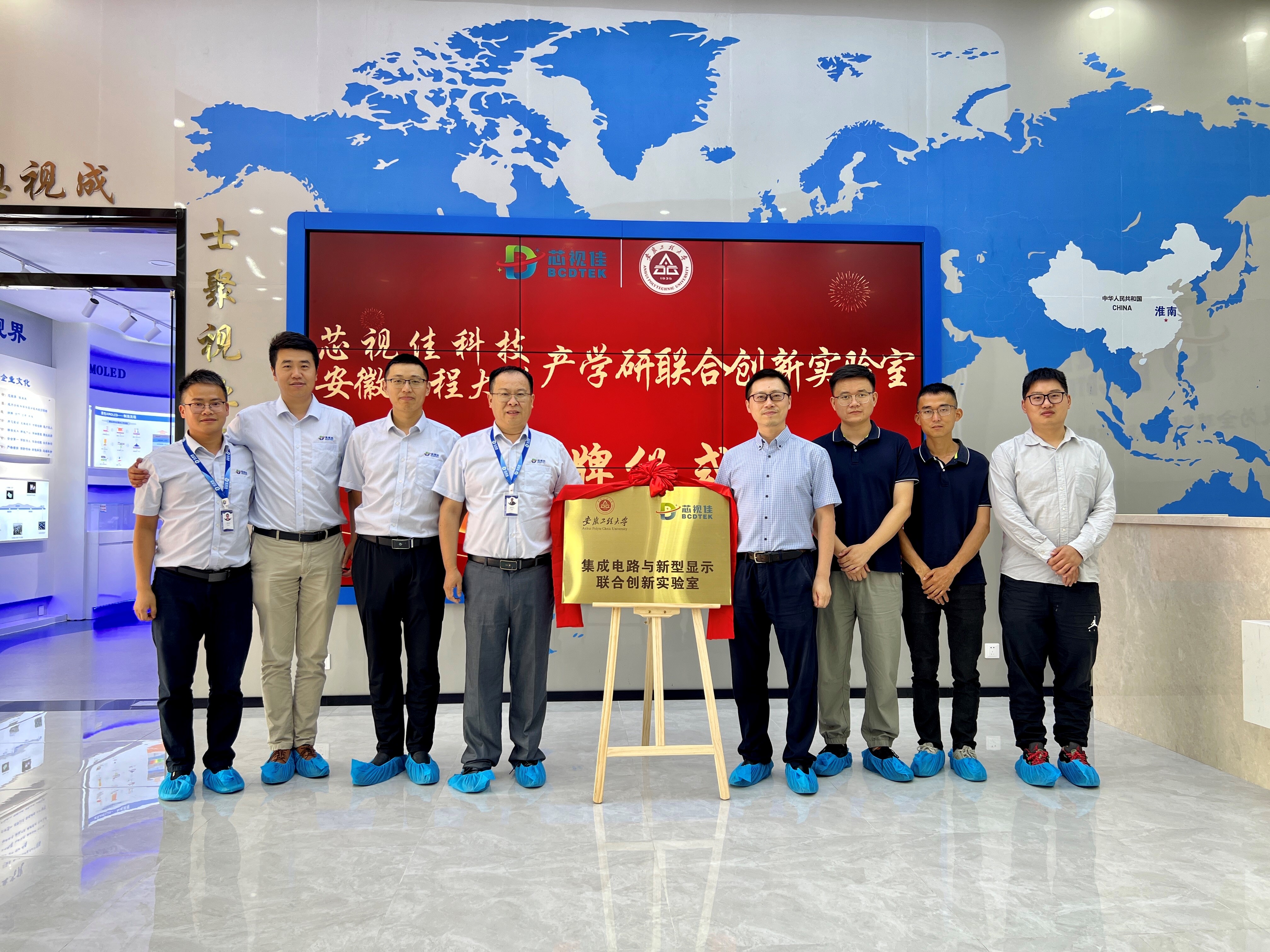 6月13日, jav (集成电路学院)副院长(主持工作)林信南与青年教师杨康、黄登朝、王翔一行4人赴安徽芯视佳半导体显示技术有限公司(淮南)开展企业交流合作活动,双方签订了产学研战略合作协议,并为校企合作共建“集成电路与新型显示”联合创新实验室揭牌。公司董事长曹绪文、总经办负责人王睿、产品负责人孙圣、沈利军等领导出席了相关活动。