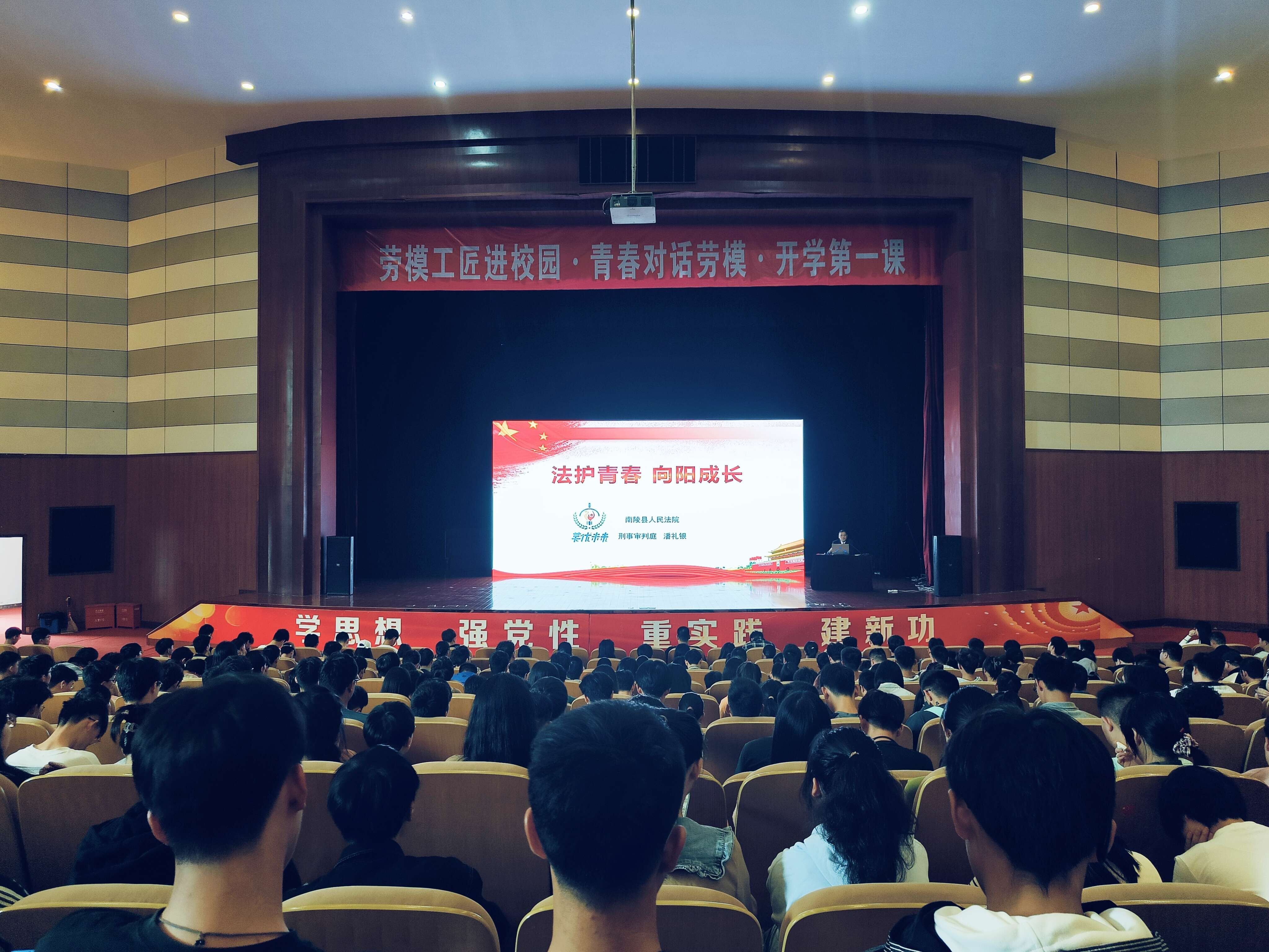 10月11日下午, jav (集成电路学院)在一站式社区师生大礼堂开展2023级全体本科和研究生新生法治专题讲座活动。活动邀请南陵县人民法院刑庭庭长潘礼银以“法护青春,向阳生长”为主题的法治讲座。学院党委副书记迟传德出席了讲座,讲座由曹聪老师主持,1000余名师生聆听了讲座。