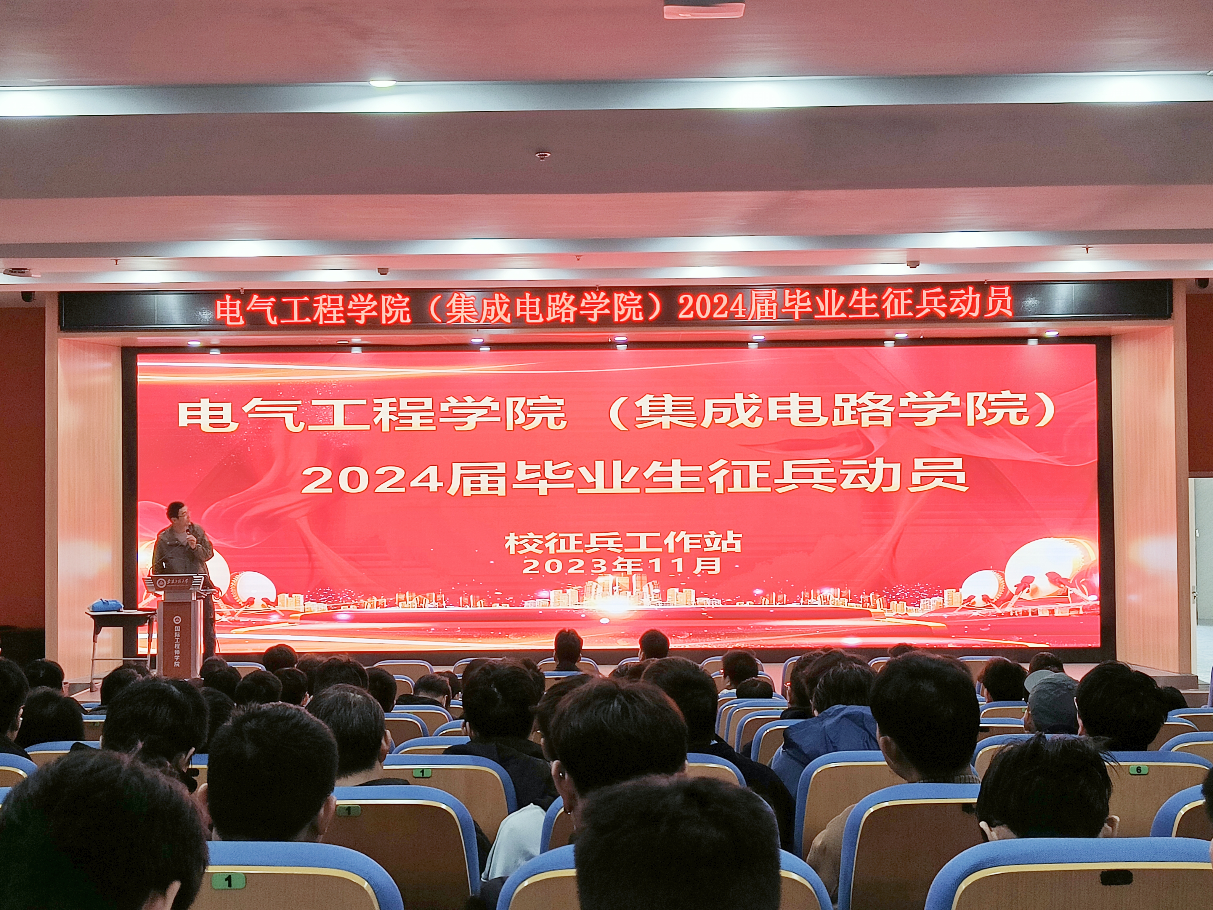 强国必须强军,军强才能国安。为积极引导学生投身国防建设,11月15日下午, jav (集成电路学院)在国际工程师学院梦溪报告厅和赤铸报告厅举行两场次2024届毕业生征兵动员会,会议邀请了学生处程启雷老师作征兵政策宣讲,学院毕业班辅导员和近500名毕业生参加了动员会。