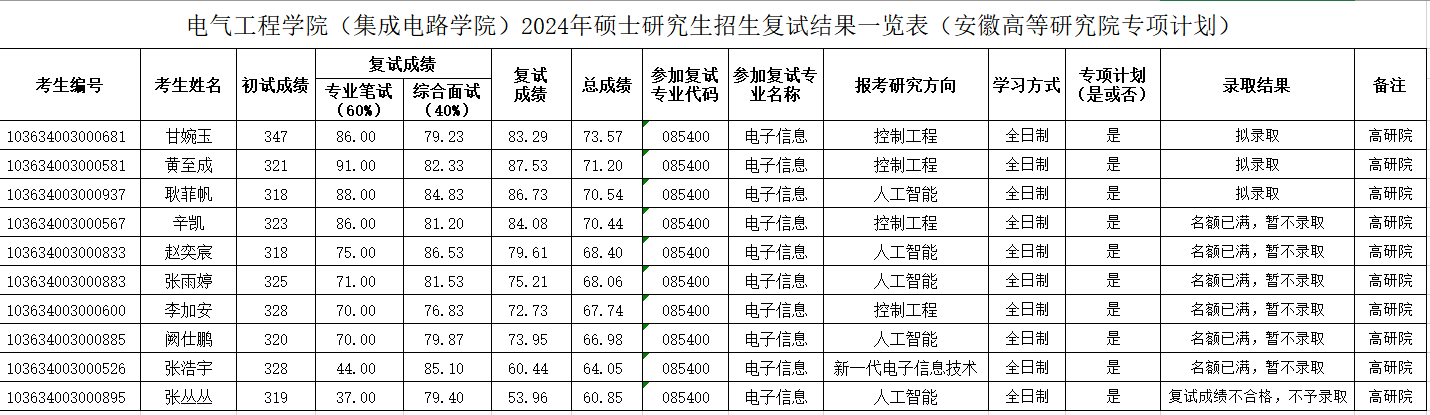jav (集成电路学院)2024年硕士研究生招生复试结果一览表(安徽高等研究院专项计划)