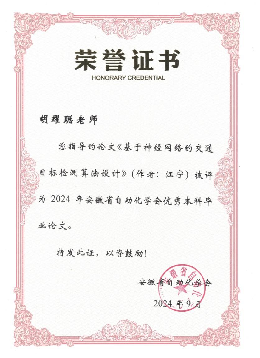 在此次评选中, jav (集成电路学院)自动化专业学生江宁同学的论文《基于神经网络的交通目标检测算法设计》赢得评委一致好评,荣获安徽省自动化学会优秀本科论文奖。该论文在胡耀聪老师的悉心指导下,立足实际应用需求,成功设计了一套适用于复杂道路场景的交通目标检测算法。这一研究不仅展现了我校学生的创新能力,更为自动驾驶技术的进步贡献了宝贵的学术成果。
