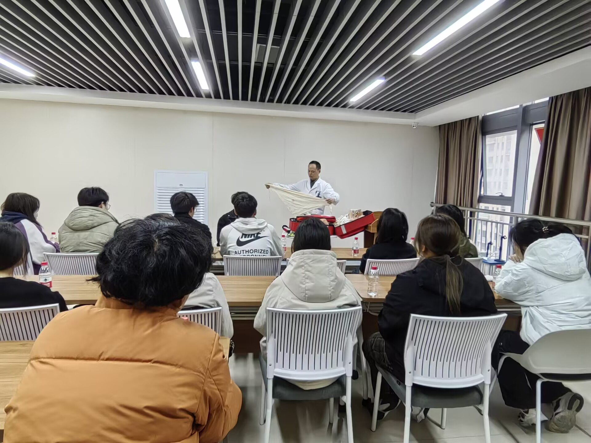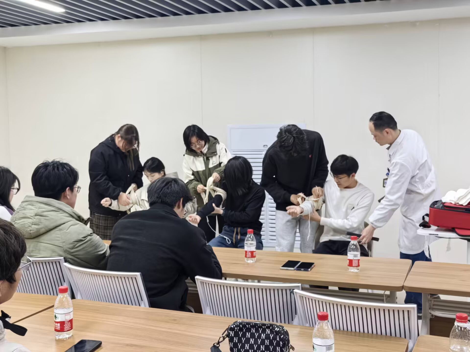 在教学演示环节,骆医师结合汶川地震、车祸现场等真实案例,强调了创伤急救“先抢后救、先重后轻”的原则,并系统讲解了伤情分类与救治顺序。针对止血技术,他详细演示了指压止血法、止血带使用等七大类止血技术,特别指出“颞浅动脉压迫法”“股动脉压迫法”的操作要点,着重强调注意止血带的使用时间、松紧度及标记规范。在包扎环节,他通过绷带环形包扎、三角巾头部包扎等实操演示,生动展示了不同部位伤口的处理技巧,并强调“先止血后包扎”的重要性。