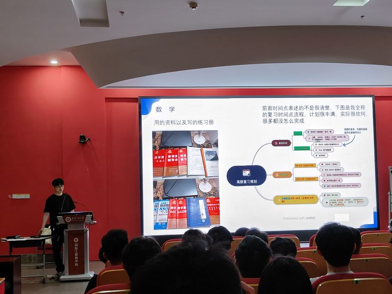 分享会伊始,上岸南京理工大学张伟豪同学率先登场,分享了自己的备考时间规划和各科目复习策略。他详细介绍了每个阶段的学习重点和目标。在专业课复习方面,同学强调要深入研究教材,构建完整的知识体系,同时结合历年真题把握考点和命题规律。随后,上岸东华大学的林佳钰同学针对英语复习提出了一些建议比如每天坚持背诵一定数量的单词,并通过做真题阅读来提高阅读理解能力和语感。还分享了自己整理笔记和错题集的方法,帮助同学们提高学习效率。上岸安徽大学王中凯同学们从复习资料的选择到复试的注意事项,从学习时间的分配到备考中的心态调整,都毫无保留地分享了自己的经验和建议。