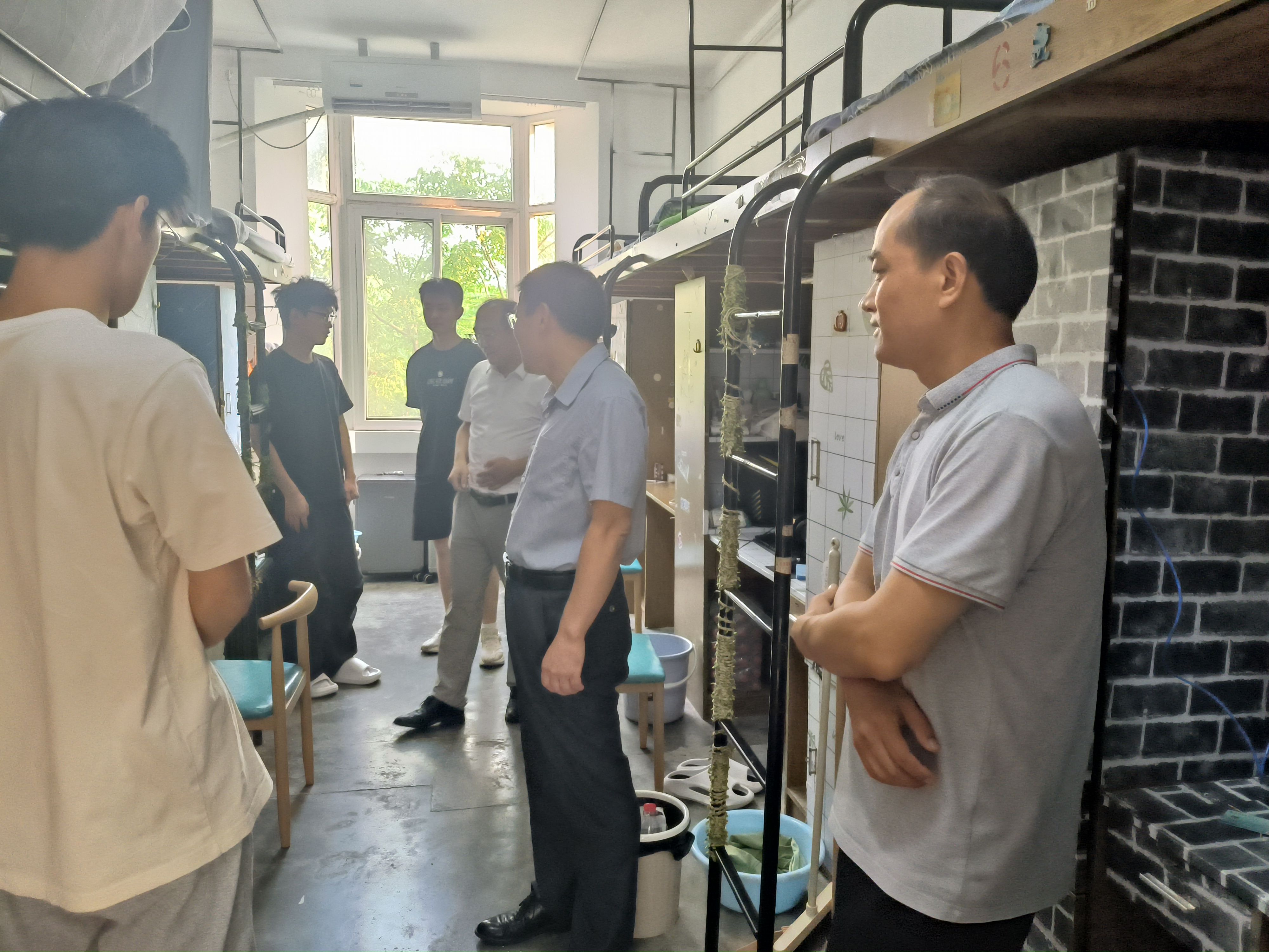 家长见面会结束后,学院党政领导与辅导员深入新生宿舍开展走访慰问。“住宿还习惯吗?有没有生活困难?”在宿舍里,领导与新生亲切交谈,仔细查看住宿环境,了解新生的生活需求与思想动态,同时叮嘱新生注意用电安全、做好宿舍卫生,尽快熟悉同学、融入集体。