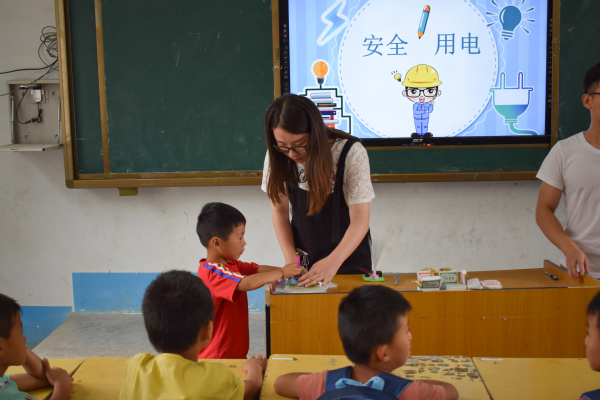 “用电安全宣传”科技扶贫小分队的同学们兵分两路,一部分在鸭湖村小学教室里,向小学生们讲解水果电池组装、光纤灯、红绿灯等电学科普玩具制作,宣传用电安全知识及电力安全歌、安全标识等。