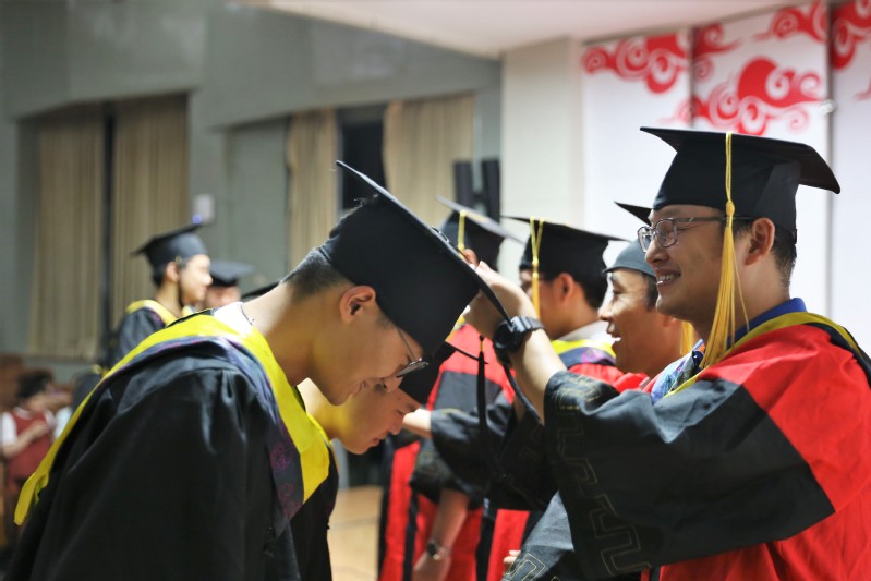 在悠扬的乐曲声中,主席台的领导、老师为参加典礼的全体毕业生扶正流苏并合影留念,同学们青春的脸庞洋溢着兴奋和激动。流苏从学士帽的右部拨到左部,代表着麦穗的成熟,象征着毕业生们圆满完成学业,学有所成。老师与毕业生的每一次握手,都传递着学校对于莘莘学子的殷切期望。
