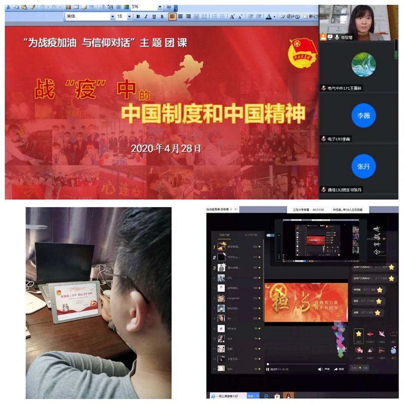学院团委于4月28日在线上召开“为战疫加油,与信仰对话”主题“云”团课。学院团委负责人围绕“最美天使为爱逆行”“党员干部日夜坚守”“一方有难八方支援”等七个方面向全体团支书以及其所联系的自动化192团支部生动诠释了战“疫”中的中国制度和中国精神。