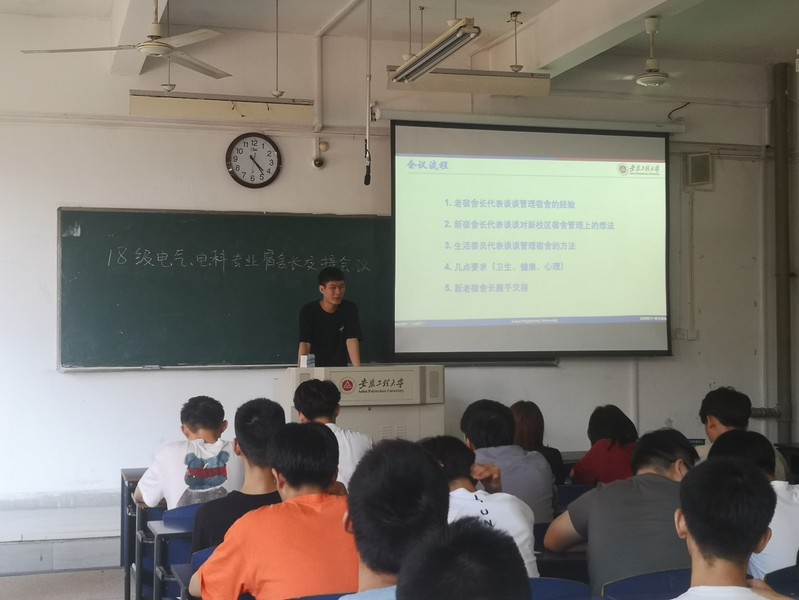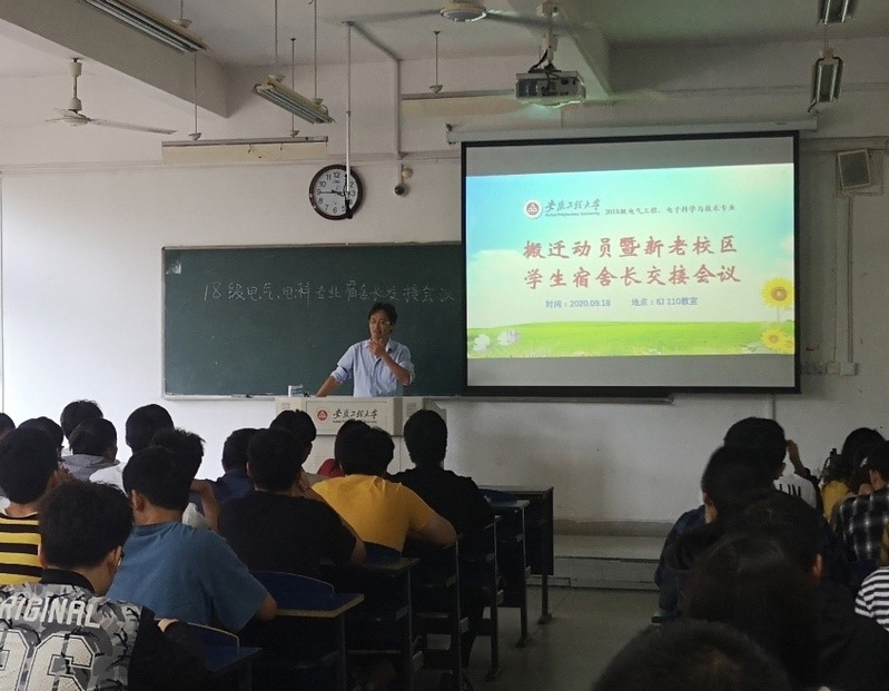 为深入做好学生思想教育工作,保证18级学生顺利搬迁到国际工程师学院,2020年9月18日下午, jav 在6J110教室开展了2018级电气工程及其自动化专业、电子信息科学与技术专业搬迁再动员暨新老校区学生宿舍长交接会议。学院党委副书记郭全根、辅导员利昕云以及各专业学生宿舍长、生活委员和部分学生代表参加了会议。