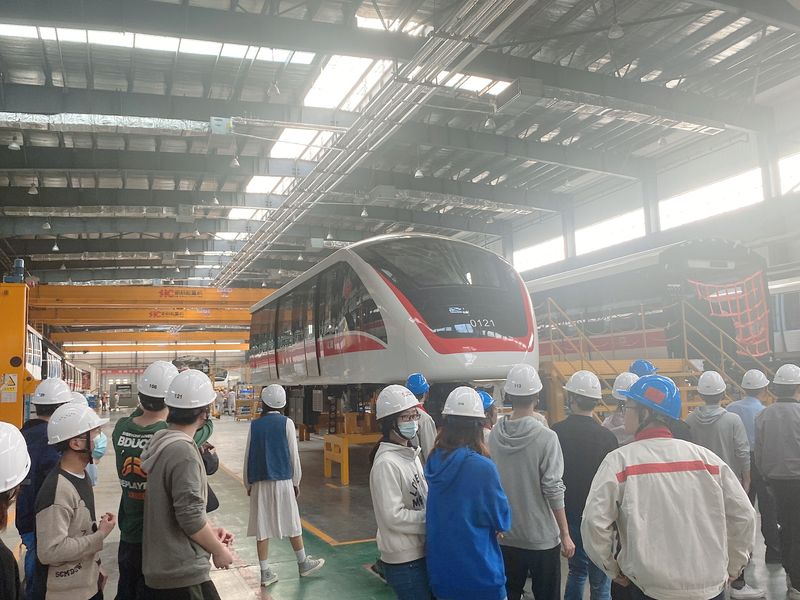 在中车浦镇庞巴迪运输系统有限公司的安排下, jav 师生首先乘坐体验了在建中的目前国内首屈一指的芜湖轨道交通跨座式单轨车辆,公司技术负责人向 jav 师生介绍了产品的设计理念与创新之处。