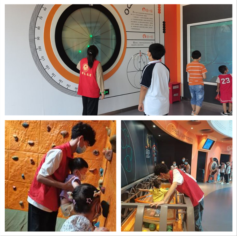 此次活动志愿者来自于2019、2020、2021级不同专业。志愿者们结合自己所学,发挥自身专业优势,开展科普讲解,在互动中向参观者解释科技馆里各种特色展项所蕴含的科学知识。面对参观的小朋友,志愿者们也是“有一手”。他们通过有趣互动,介绍项目操作方法,并指导小朋友们亲自体验过程,让他们感受到科技的魅力。