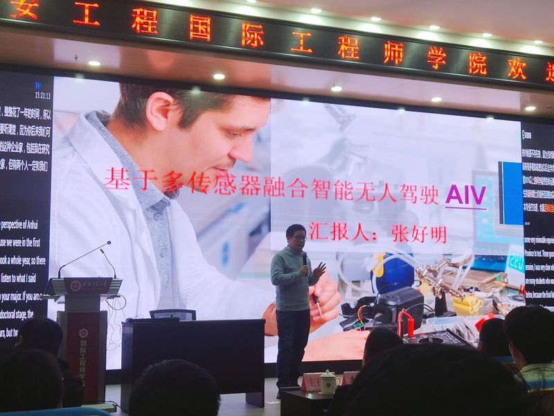 报告开始,张好明教授回忆了自己与 jav 的点点滴滴,拉近了和同学们距离。在对基于多传感器融合智能无人驾驶AIV技术进行科普之后,他谈到,学弟学妹们对顶尖的技术不要产生畏惧的心理,要善于敢于学习新技术,要通过提升自身学历,实现更高质量就业。