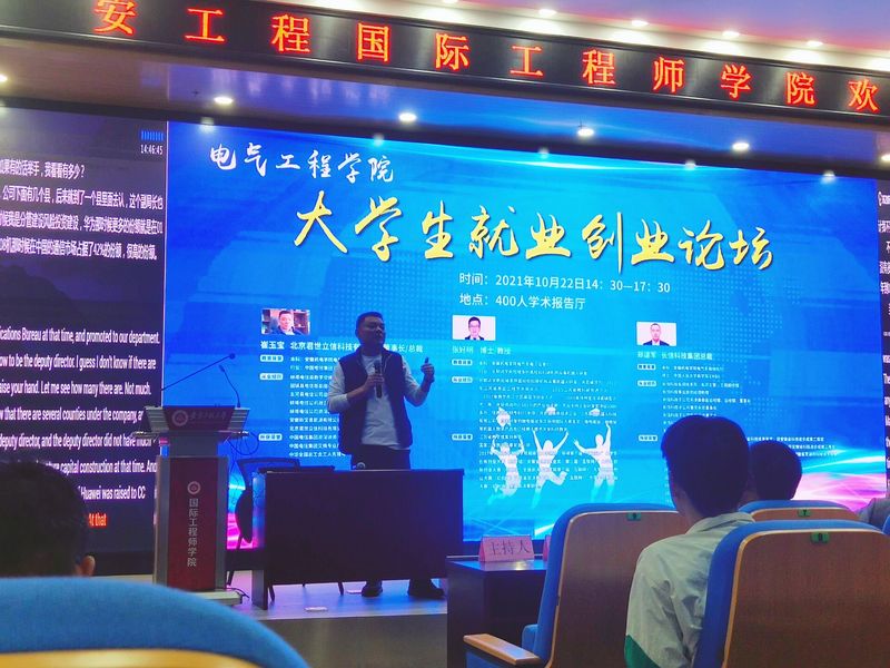 北京君世立信科技有限公司董事长崔玉宝与学弟学妹们分享了自己学习和成长经历。他说,大学是梦想的殿堂,是给予大家最多人生思考、最多汗水与最多欢乐的地方。他希望学弟学妹们要认真学习,充分利用周边资源,抓住生命中的每一次机会,以饱满的热情投入到人生的梦想中去。