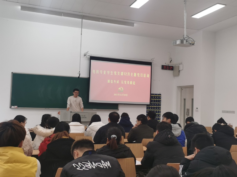12月29日下午, jav 电科专业学生党支部在国际工程师学院X102教室开展“诚信考试,从党员做起”主题党日活动。支部全体40名党员和27入党积极分子参加活动。活动由党支部书记阳岚主持。