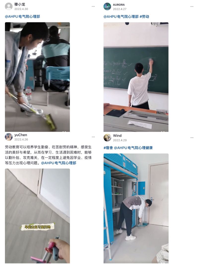 校本部和国际工程师学院校区200余名学生通过在校园内拍摄劳动视频,上传到抖音平台并@AHPU电气院心理部抖音账号,参与了此项活动。集成211崔明飞表示:“虽然劳动是辛苦的,但是心里是很开心的。疫情当下,劳动教育不仅可以培养我们吃苦耐劳的精神,还可以让我们感受到生活中的美好”。此项活动有助于增强学生的劳动意识,激发劳动情感、锤炼劳动意志、培养劳动能力,对心理健康教育有明显的促进作用。