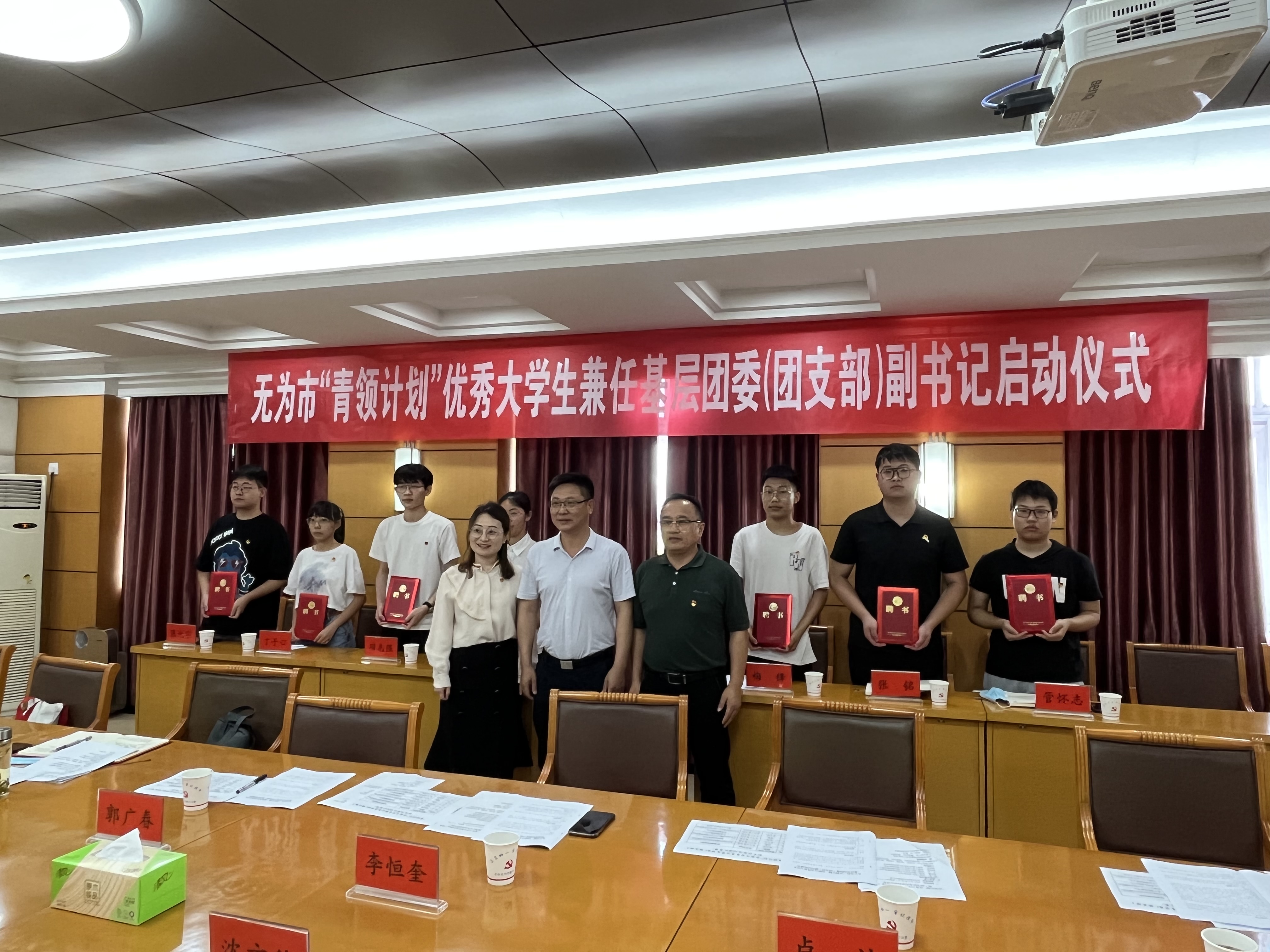 6月30日, jav 与无为市团委在无为市政府会议室举行“青领计划”启动仪式。团芜湖市委副书记谢翔宇,无为市组织部部长陈兆强,校团委书记郭广春、学院党委副书记李恒奎、学院和无为市团委有关同志以及选聘的7名优秀大学生出席仪式。