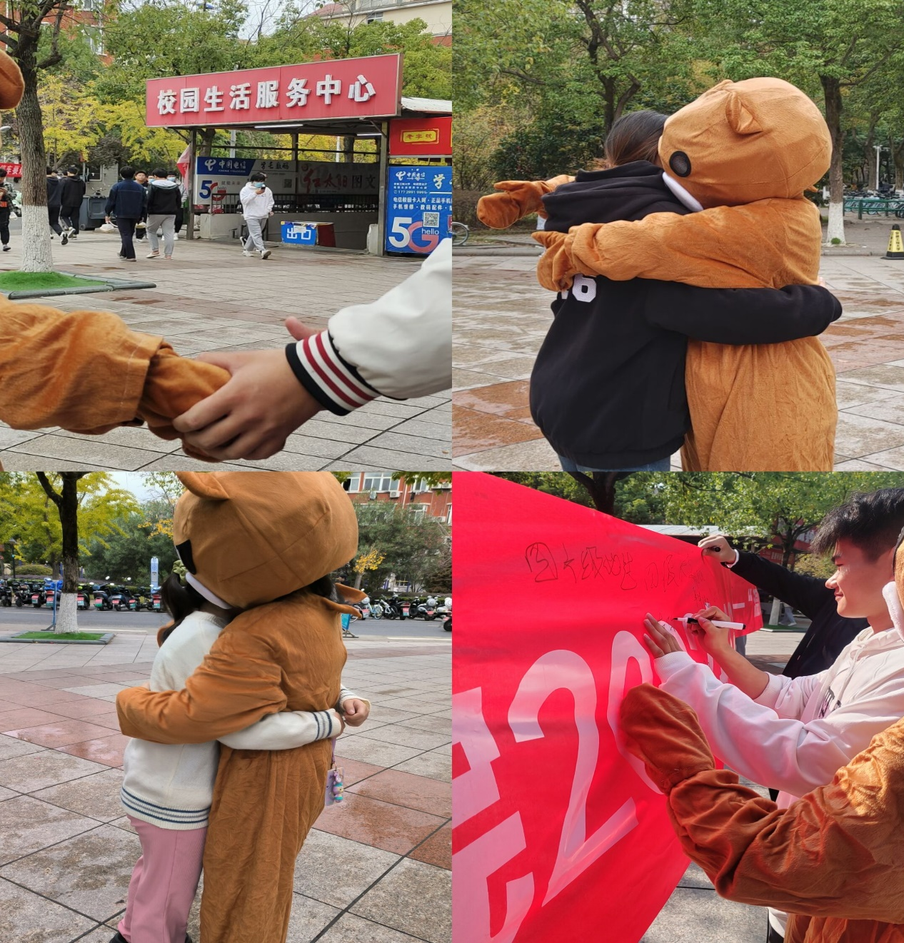立冬已过,寒冬将至。一个温暖的拥抱能融化人与人之间的隔阂,一句善意的祝福能驱赶心中的严寒。活动现场的横幅与热闹的场景吸引了不少路过的同学们,大家纷纷驻足与身穿玩偶服的志愿者们拥抱,并在横幅上留下自己对未来生活的美好祈愿与期盼。同学们在“所抱”的过程中敞开了心扉,拉近了距离,传递了积极向上、阳光乐观的校园正能量;在横幅上用心用爱为祖国的繁荣昌盛、为家人朋友的安康、为考研同学的成功“上岸”送上祝福。活动现场一片欢声笑语,驱散了在场的每个人心中的烦恼与苦闷,大家用微笑和怀抱尽情地表达自己的心愿。