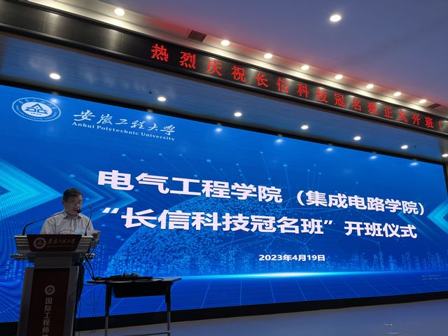江明代表学院对出席仪式的领导和嘉宾表示衷心感谢和热烈欢迎,并介绍了学校办学历史以及近年来学校和学院建设发展情况。他表示,冠名班是芜湖市紫云英人才计划的重要组成部分,是进一步深化产教融合、校企合作、协同育人的重要举措。冠名班的成立是校企实现深度合作的标志,学院将以此次冠名班开班为契机,进一步发挥高层次应用型本科人才培养优势,围绕产业技术和人才需要,在产学研、人才培养、平台建设等方面和长信科技开展全方位、宽领域的合作。同时,他希望冠名班学员能够抓住机遇,认真学习专业知识,刻苦训练专业技能,强化动手实践能力,练就真本领,以实际行动回报社会。