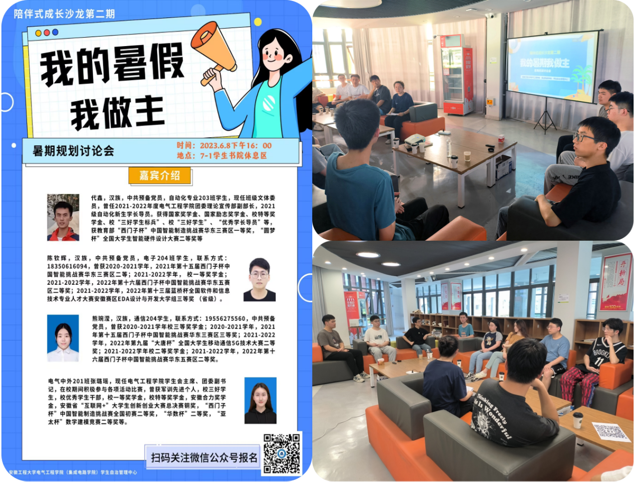 为落实学校“三全六专”育人实践工作,丰富学生社区生活,推进“一站式”和谐社区建设,指导学生做好暑期规划,过好快乐充实假期,6月8日, jav (集成电路学院)学生自治管理中心在7-1学生书院举办了题为“我的暑假我做主——暑期规划讨论会”的沙龙活动。