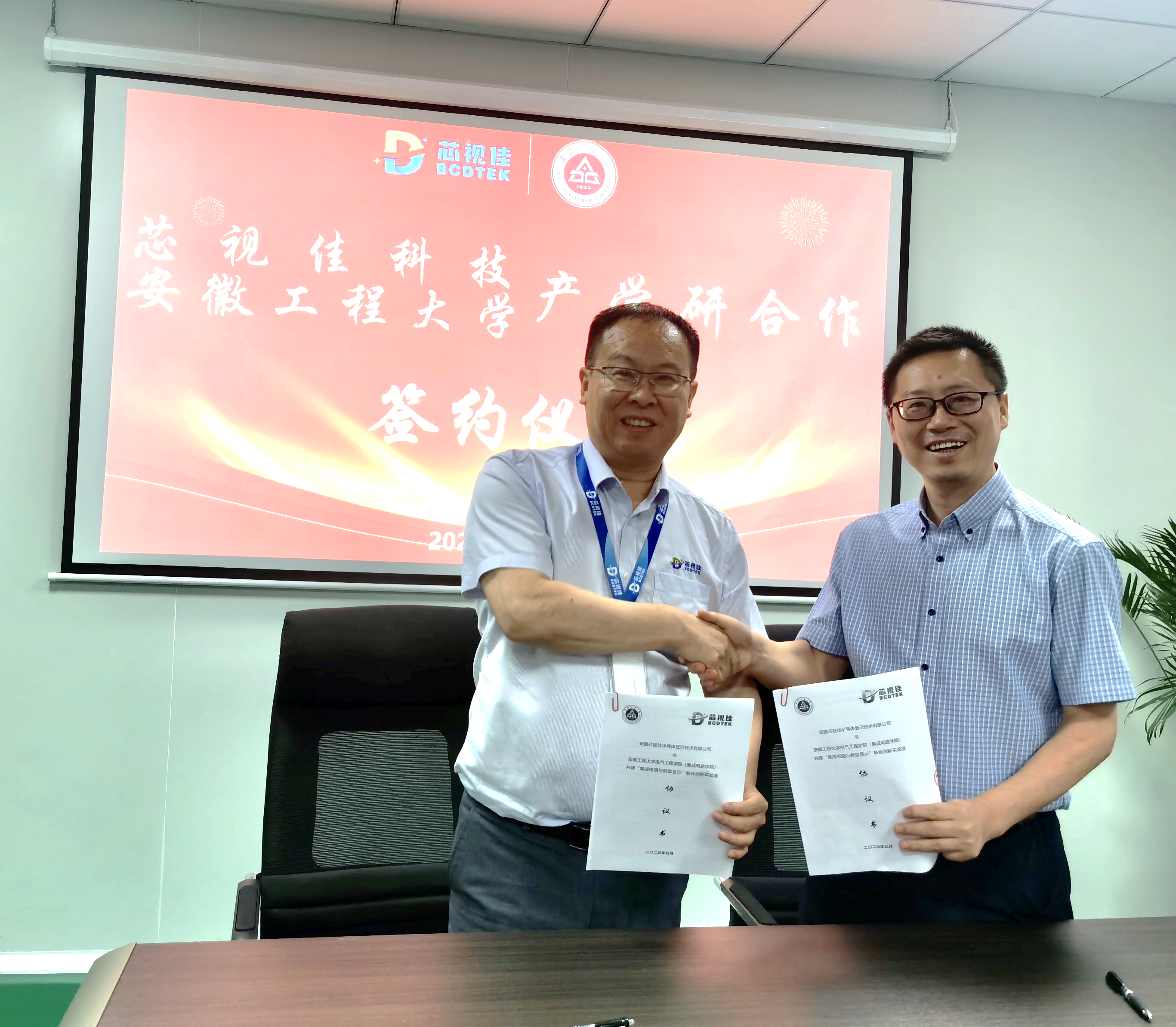 6月13日, jav (集成电路学院)副院长(主持工作)林信南与青年教师杨康、黄登朝、王翔一行4人赴安徽芯视佳半导体显示技术有限公司(淮南)开展企业交流合作活动,双方签订了产学研战略合作协议,并为校企合作共建“集成电路与新型显示”联合创新实验室揭牌。公司董事长曹绪文、总经办负责人王睿、产品负责人孙圣、沈利军等领导出席了相关活动。