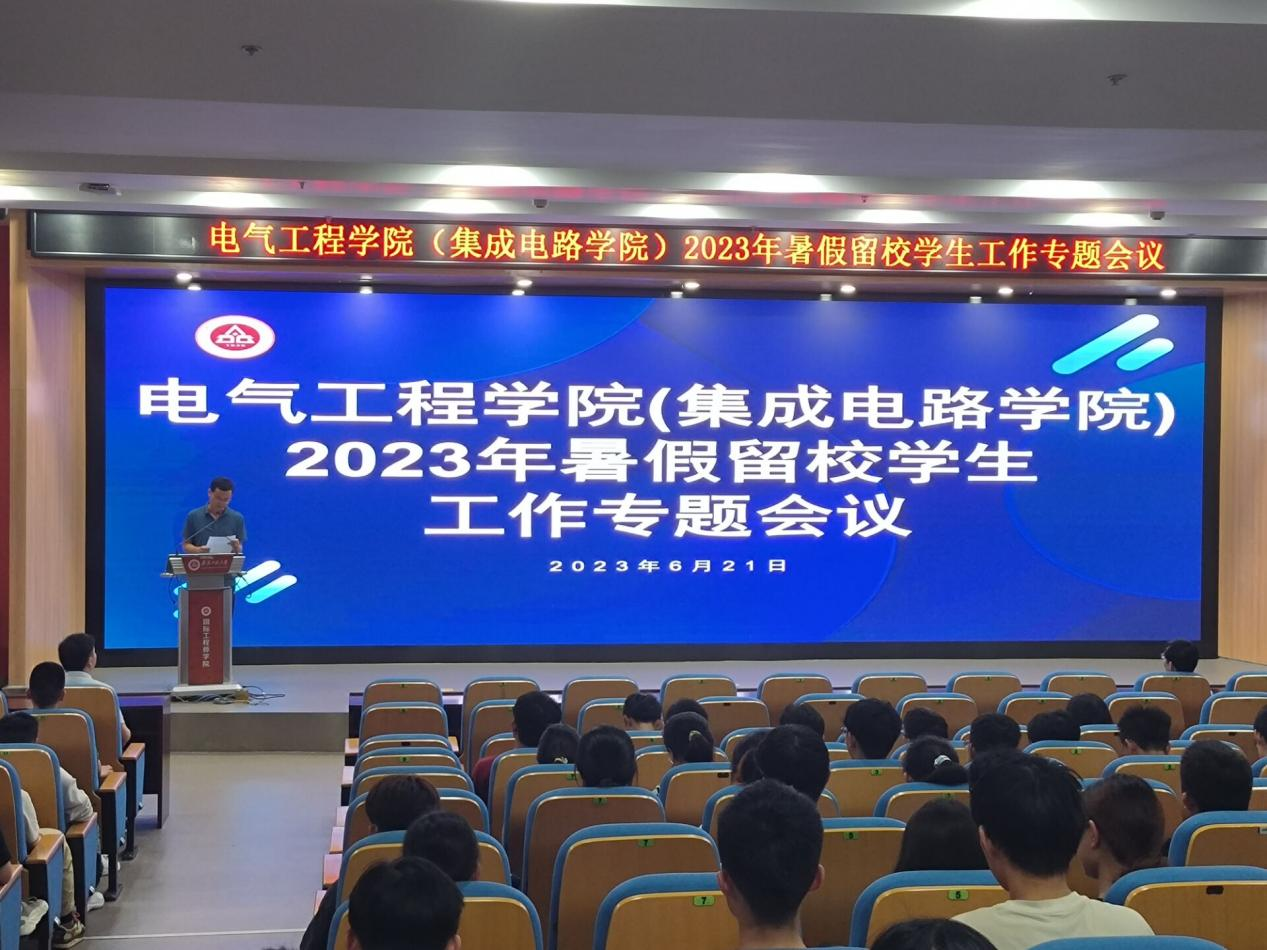 为进一步贯彻学校“三全六专”育人实践要求,落实学校《关于加强暑期留校学生教育管理的通知》精神,6月21日上午, jav (集成电路学院)在国际工程师学院大报告厅召开暑期留校学生安全工作专题会议,以增强留校学生安全防范意识,维护假期校园安全稳定。学院党委书记杨会成、党委副书记迟传德、全体辅导员及800多名留校学生参加了此次会议,迟传德主持会议。