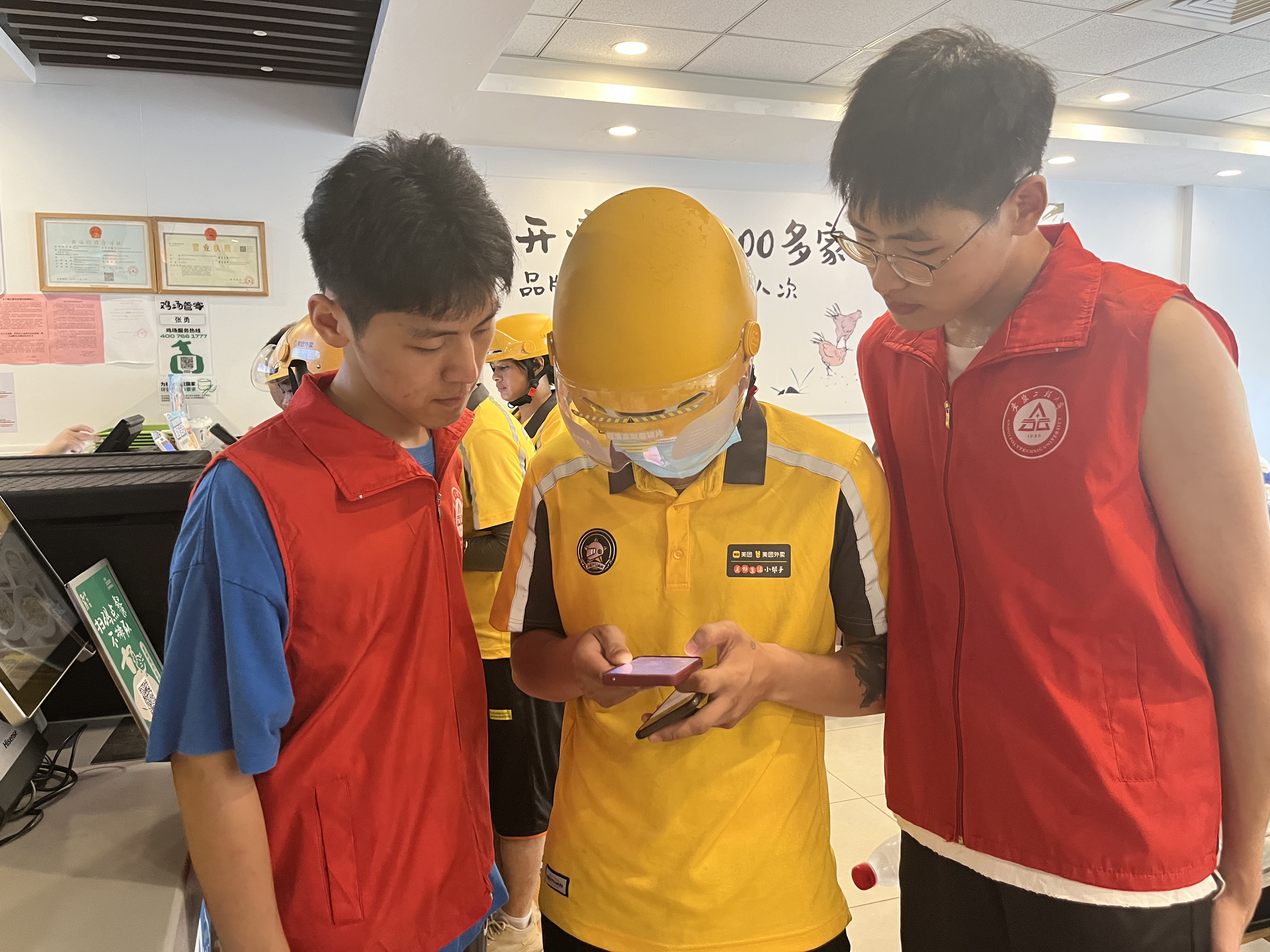 在星悦广场,小分队成员向外卖员们发放了调查问卷,主要了解外卖员们的日常收入和工作时长。张师傅从事外卖送餐行业3年多了,他边填写问卷边和分队成员聊着,他说:“每天接单量约为40到50单,上午11时到中午1时,下午5时到7时是配送的高峰时段,在线工作时间达10多个小时。每天辛苦但也很充实,选择这项工作主要是自由,既可以方便地照顾家庭,也有着不错的经济收入。”自动化20级张铭表示,通过交流,了解到目前很多外卖员在劳动者权益保障上还有很大欠缺,自己回校后,会深入研究这个群体,后期组建志愿服务团队,力所能及地为他们提供帮助。