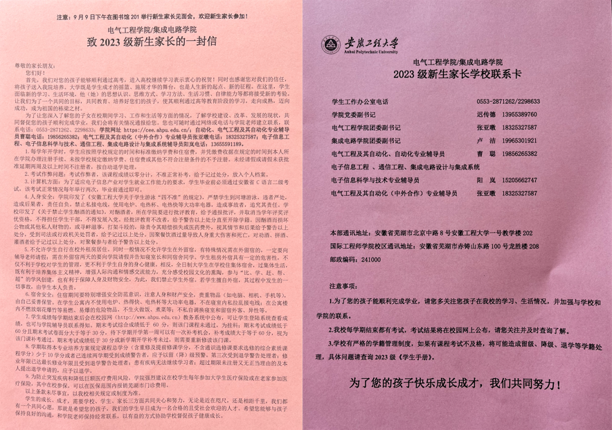 致家长的一封信、新生家长学校联系卡、防诈骗手册,“迎新准备篇”的一项项具体工作也有条不紊地开展起来。今年,学院为每一位家长准备了一份详细的《致家长的一封信》,辅导员以及学长导员精心准备的这一系列迎新资料让新生和家长们感受到了学院的温馨服务。各项迎新工作都能及时完成,受到了各位新生以及家长们的点赞。