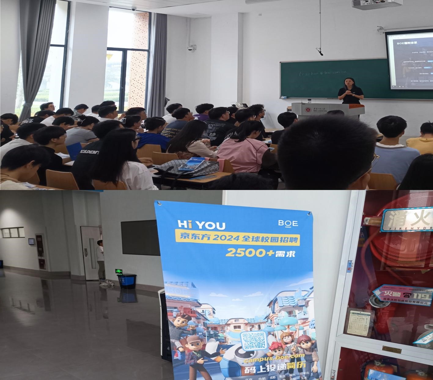 就业是最大的民生。高校毕业生就业工作更是占有举足轻重的地位。为进一步落实学校“三全六专”育人实践,做好毕业生就业育人工作。9月15号上午,学院秋季首场招聘宣讲会在国际工程师学院校区学习中心X106开展,京东方科技集团股份有限公司助力学院拉开2024届毕业生就业工作序幕。宣讲会现场同学们手持简历积极参加,教室座无虚席,甚至后排门口站满了来听宣讲的同学。宣讲结束后,同学们积极向人事经理递交了自己的简历,现场的一位同学说:“听了这家公司的介绍,总体感觉还是非常不错的,很符合自己的预期,而且这家公司也很开放包容。担心自己在竞争激烈的考研氛围中落败,就想着找个工作,再认真备考,做到手中有粮、心中不慌。”
