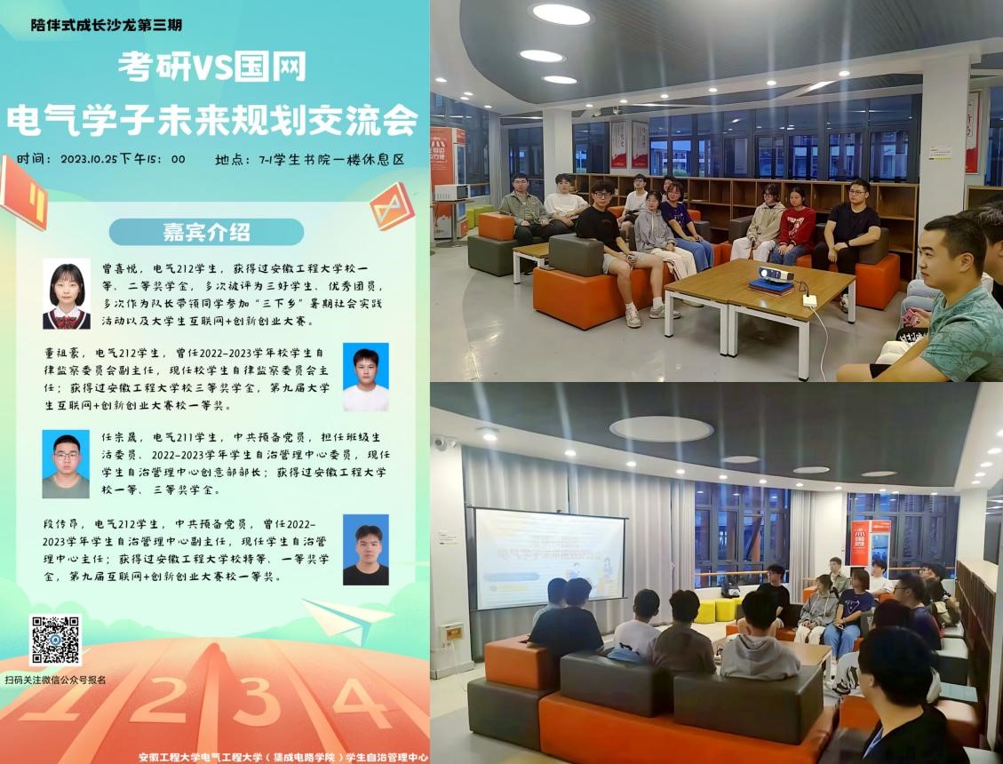 为进一步落实学校“三全六专”育人实践,丰富学生社区生活,推进“一站式”和谐社区建设,指导学生做好未来规划,丰富校园生活,10月25日, jav (集成电路学院)学生自治管理中心在7-1学生书院举办了题为“考研VS国网——电气学子未来规划交流会”的沙龙活动。