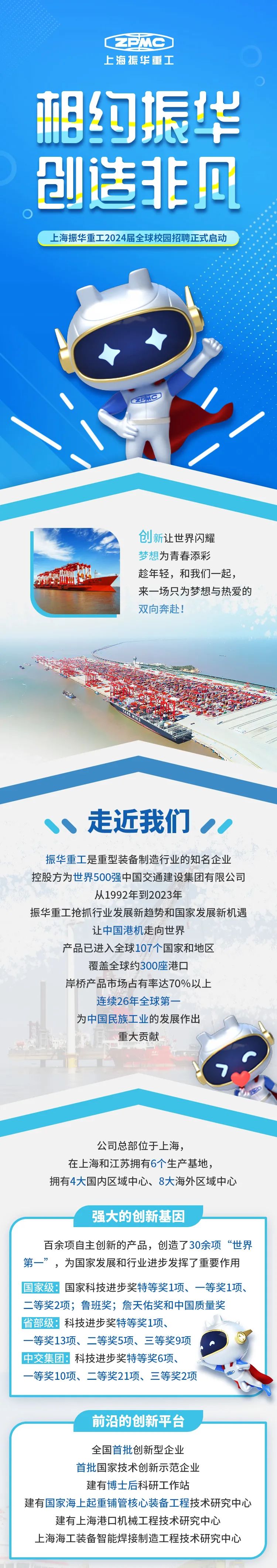| 公司简介:上海振华重工是重型装备制造行业的知名企业,国有控股A、B上市公司,控股方为世界500强中国交通建设集团有限公司。从1992年到2023年振华重工抢抓行业发展趋势和国家发展新机遇,让中国港机走向世界,产品已进入全球107个国家和地区,覆盖全球约300座港口,岸桥产品市场占有率达70%以上,连续26年全球第一,为中国民族工业的发展做出重大贡献。 | ||||