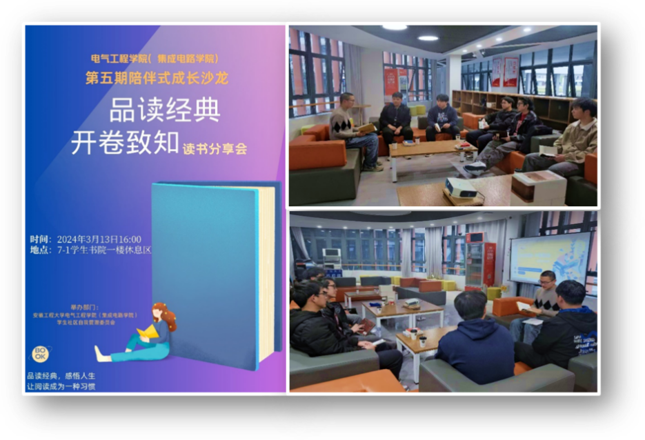为推深做实学校党建“三抓”工作要求,强化“三全六专”育人实践,聚焦“和起来”,营造一站式学生和谐社区文化氛围,3月13日, jav (集成电路学院)在学院“青衿”一站式学生和谐社区开展“品读经典 开卷致知”读书分享会暨第五期陪伴式成长沙龙活动。