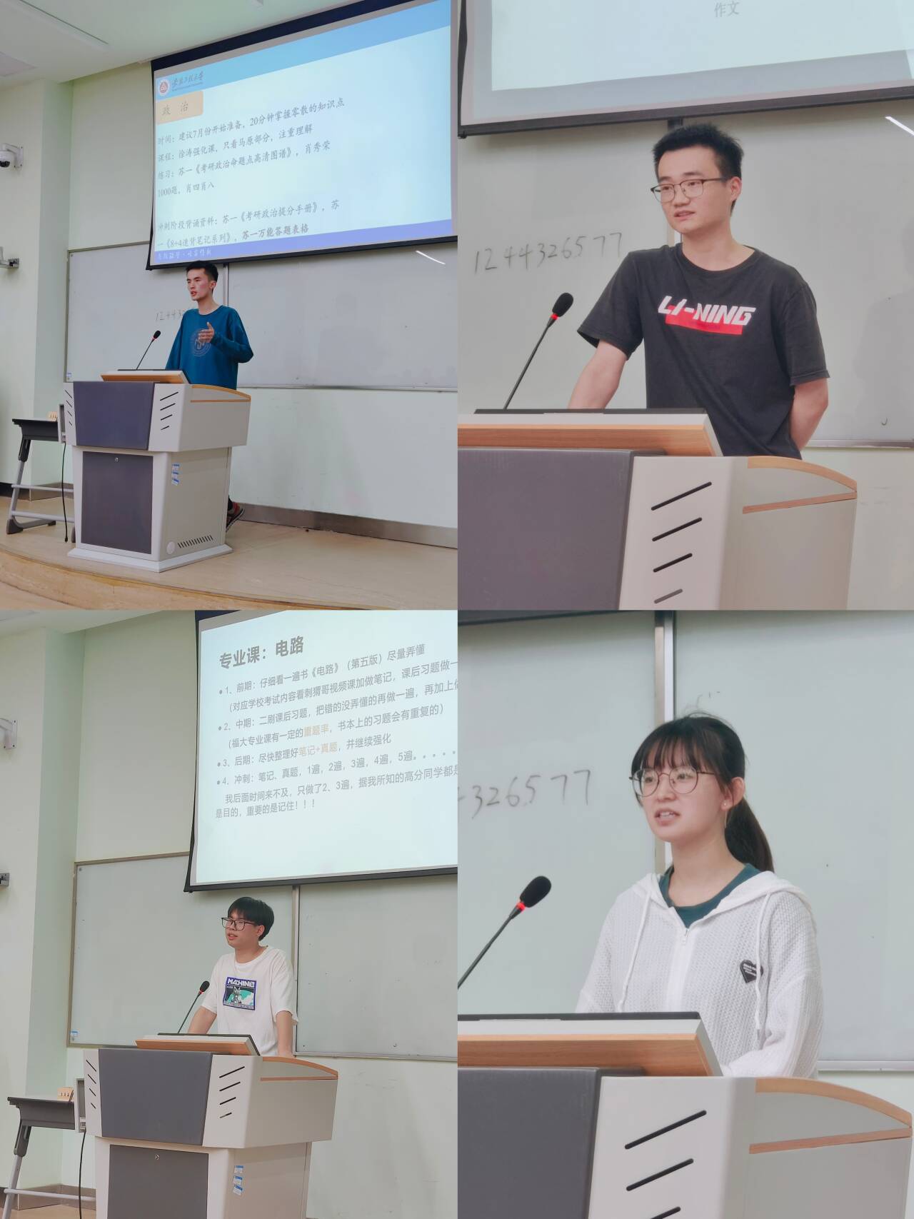 活动伊始,邱意敏同志介绍了2024年电子科技协会和智能控制协会成员在考研方面的整体情况随后,考取北京理工大学司嘉宜山东大学黄紫辰东北林业大学代鑫福州大学杨伟龙几位同学依次上台,结合自身考研经验,深入浅出地分享了备考期间如何科学安排各科复习时间、如何在紧凑的时间内最大化地掌握专业知识、以及怎样准确把握学科考试的重点和难点等宝贵经验。在提问交流环节支部成员们积极发言,就学习、学科竞赛、考研备考等方面遇到的疑惑进行了提问。学长学姐们耐心倾听,并逐一给出了详尽的解答和建议。同时,学长学姐们还留下了自己的联系方式,表示欢迎同学们在后续学习过程中随时提问,共同解决学习难题。