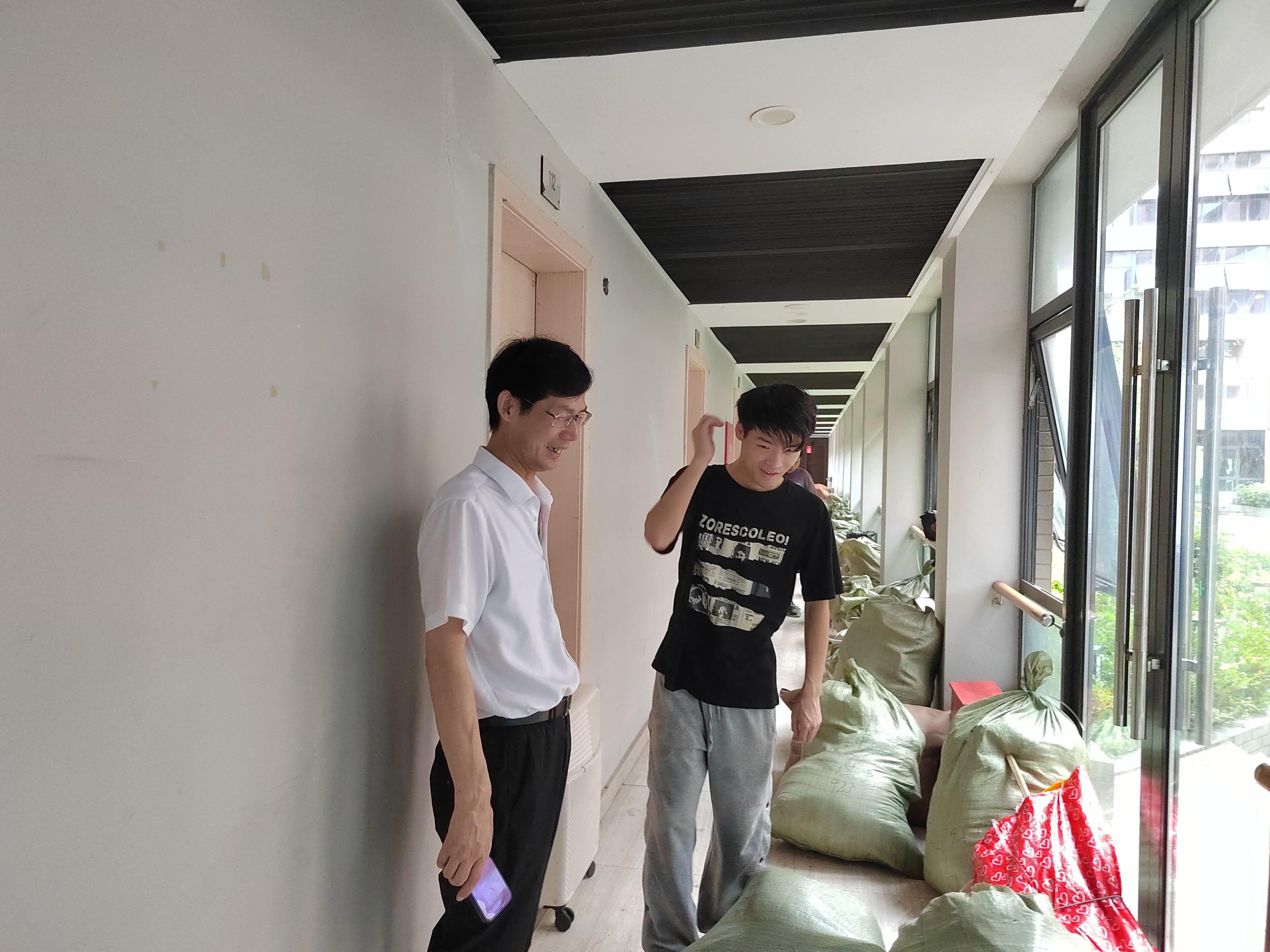 师生同心,绘就风景。学院领导第一时间深入宿舍,学院党委书记杨会成对全体搬迁同学表示深切的关怀,他提醒同学们防止淋雨感冒,也要防止雨水淋湿衣物。他进入每一间宿舍与学生亲切交谈,并现场解决问题。他强调,搬迁工作要以生为本,辅导员老师既要妥善处理好同学被子淋湿的眼下问题,又要处理好搬迁后适应性问题,时时处处都要想着学生,心中有爱,眼里有光。