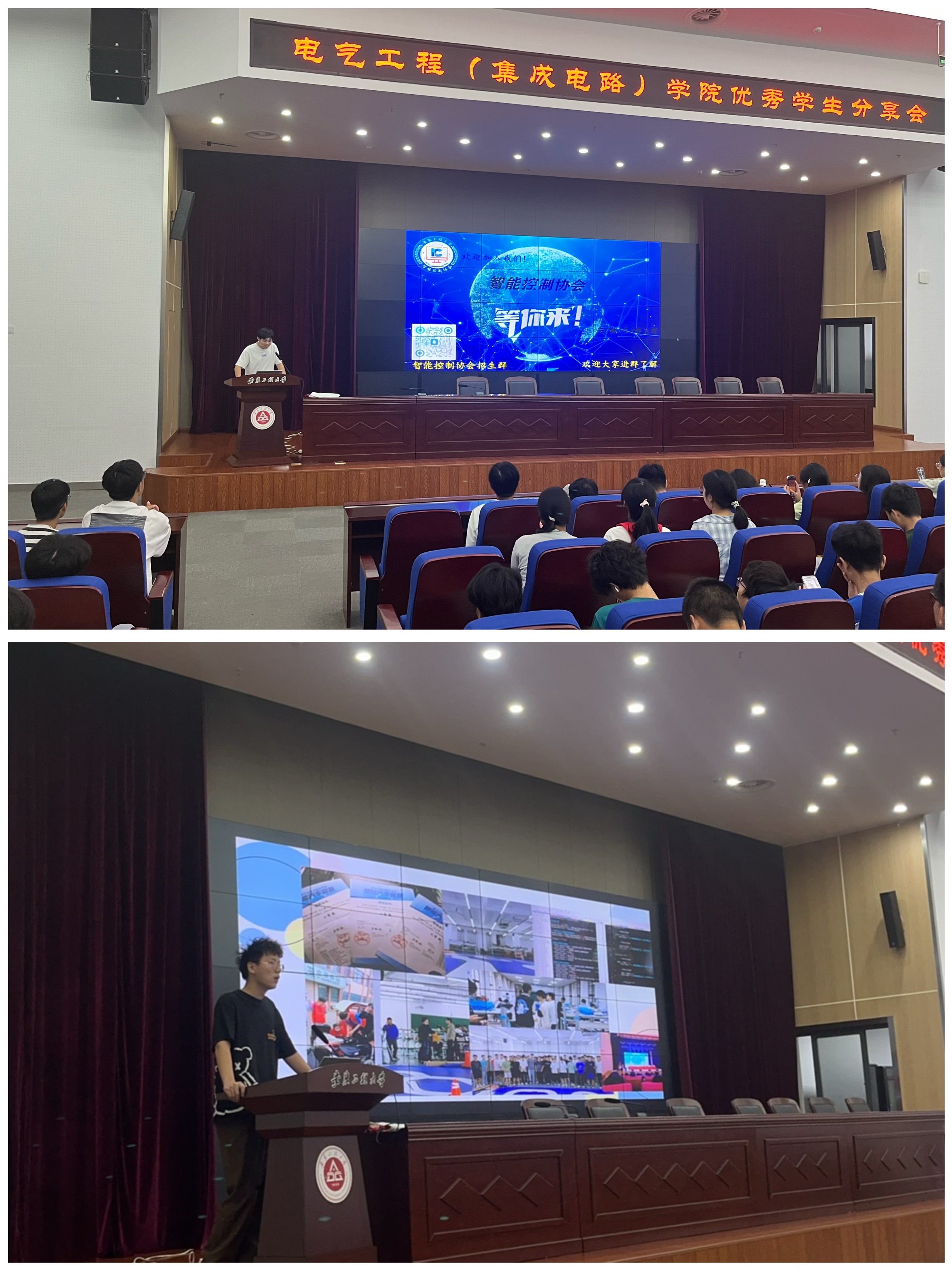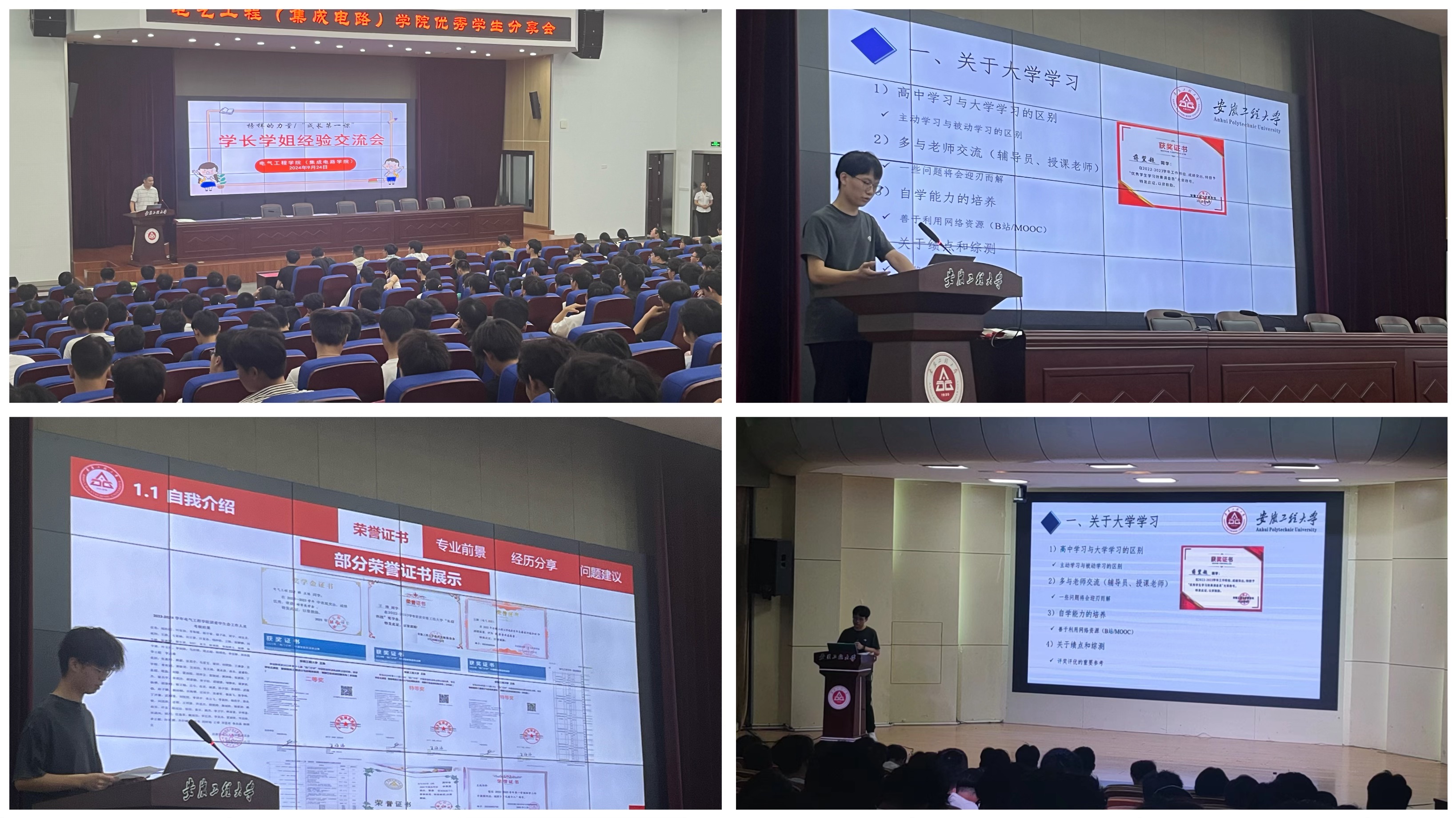 (集成电路学院)分别在图书馆五楼会议室、学术报告厅举办以“青春逐梦 榜样领航”为主题的优秀学子成长经验分享会。四位优秀的学长学姐和社团协会负责同学受邀给学院1100多名2024级新生分享成长经验。