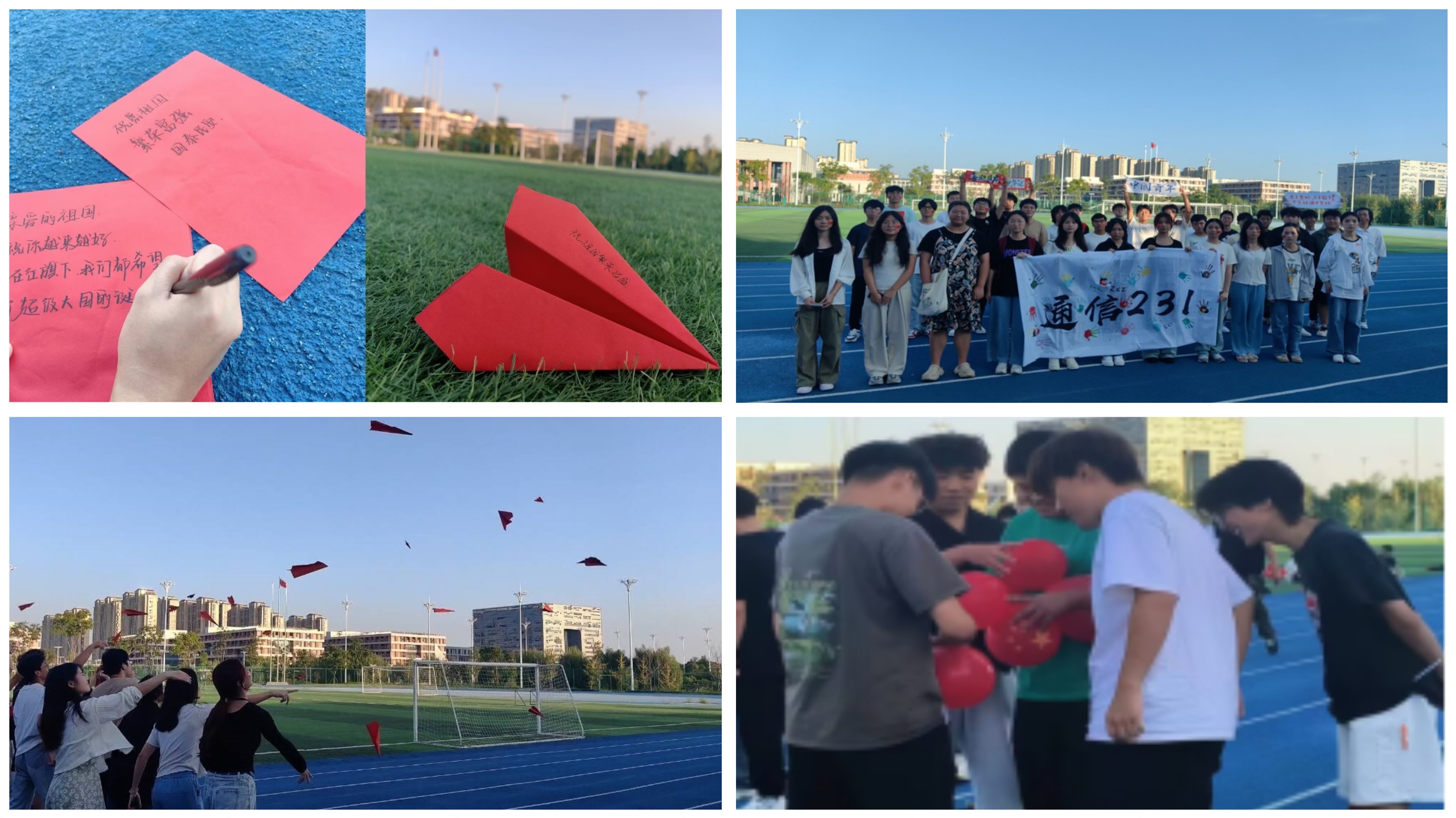通信231团支部邀请新加入班级的转专业同学做了自我介绍,开展了一些增进互相了解的小游戏,组织新的班级全体同学齐声高唱《歌唱祖国》,在“放飞纸飞机”环节,同学们在红色彩纸上写下对未来的寄语和对祖国的祝福,折成纸飞机后放飞,让这些满载希望与感激的纸飞机飘扬在校园的上空。团支部书记李子怡说道:“一个个写满祝福语的纸飞机飞出的不仅仅是我们的梦想,更是我们对祖国的美好祝愿。”