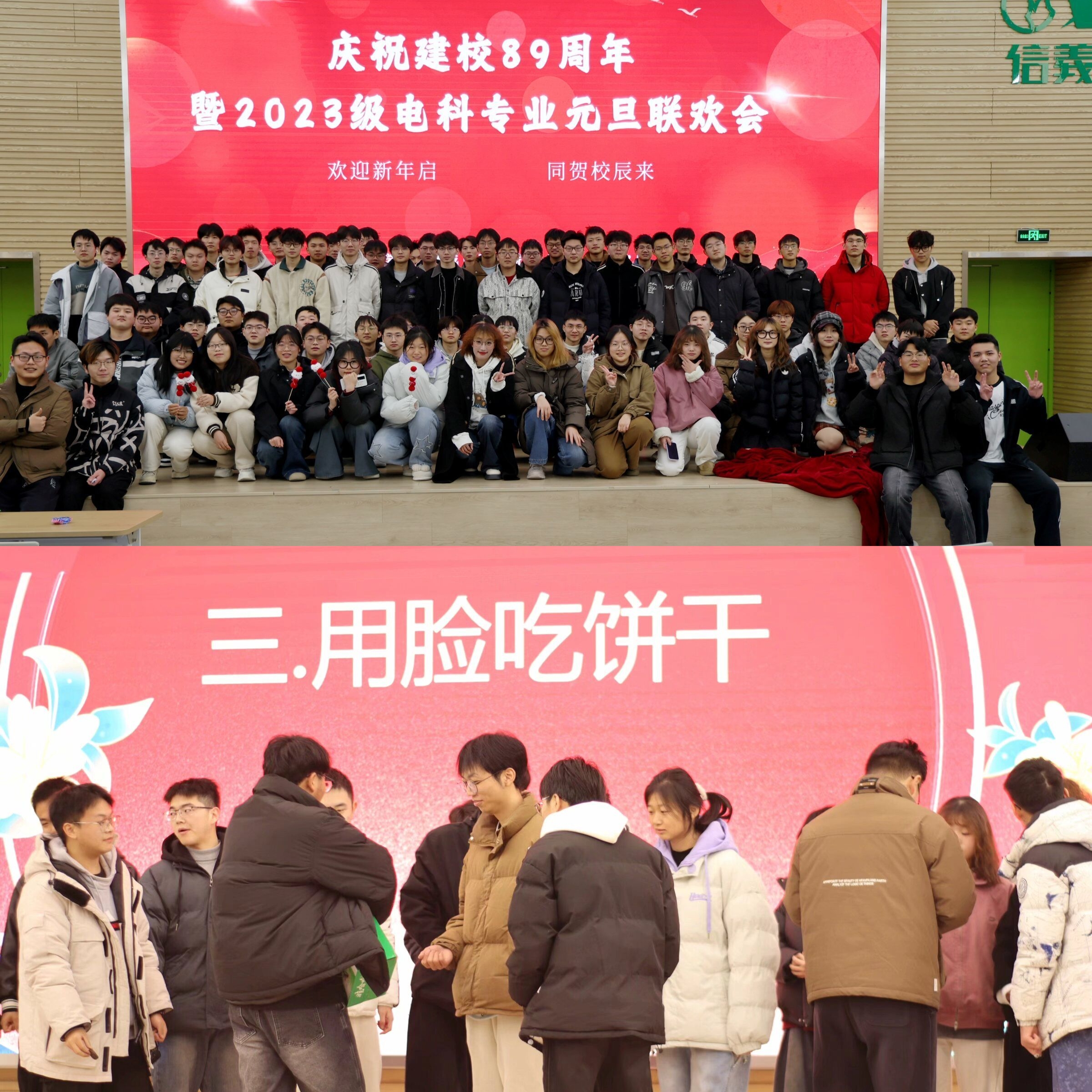 电科专业以“欢迎新年启·同贺校辰来”为主题举办建校89年暨庆元旦联欢会,师生欢聚一堂,共同迎接新年的到来。联欢会在一曲温馨动人的合唱《小美满》中拉开帷幕歌声悠扬婉转,如潺潺溪流沁人心脾,瞬间让现场沉浸在一片温馨的氛围之中。而当激昂奋进的《夜空中最亮的星》响起时,全场气氛再度高涨,同学们纷纷跟着节奏哼唱。除了表演环节,互动游戏环节也是趣味十足。同学们迅速开动脑筋,争先抢答。