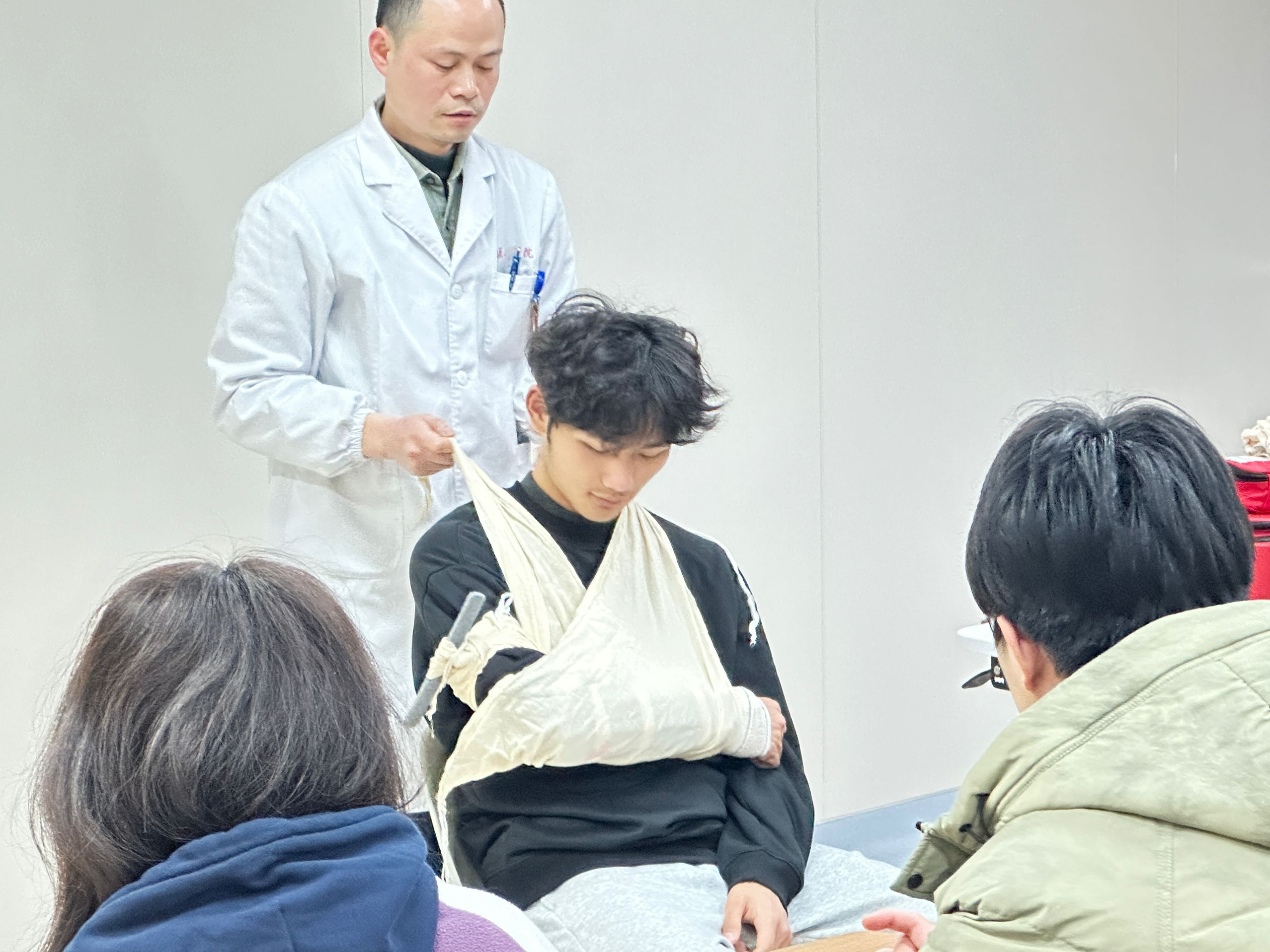 在教学演示环节,骆医师结合汶川地震、车祸现场等真实案例,强调了创伤急救“先抢后救、先重后轻”的原则,并系统讲解了伤情分类与救治顺序。针对止血技术,他详细演示了指压止血法、止血带使用等七大类止血技术,特别指出“颞浅动脉压迫法”“股动脉压迫法”的操作要点,着重强调注意止血带的使用时间、松紧度及标记规范。在包扎环节,他通过绷带环形包扎、三角巾头部包扎等实操演示,生动展示了不同部位伤口的处理技巧,并强调“先止血后包扎”的重要性。