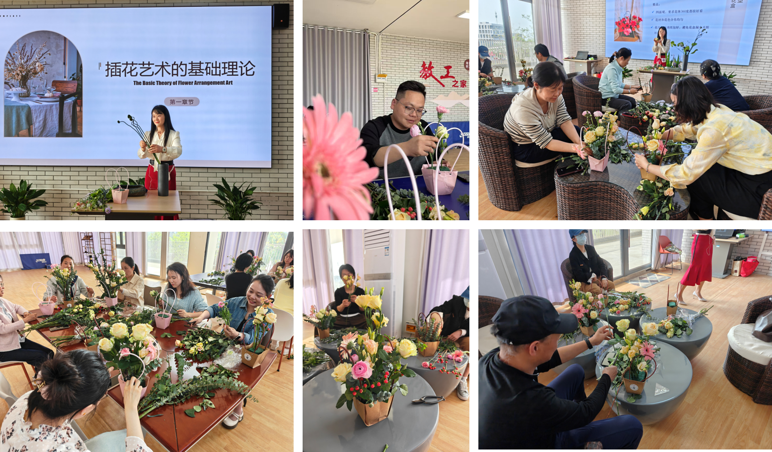 本次活动特邀国家注册高级花艺师张群现场指导。张老师从花材选择、色彩搭配、造型设计等方面深入浅出地讲解了插花艺术的基本技巧与审美要点,并分享了不同花型所蕴含的意境与情感表达。她生动的演示,让在场教职工对这门“指尖上的艺术”有了更直观的认识。