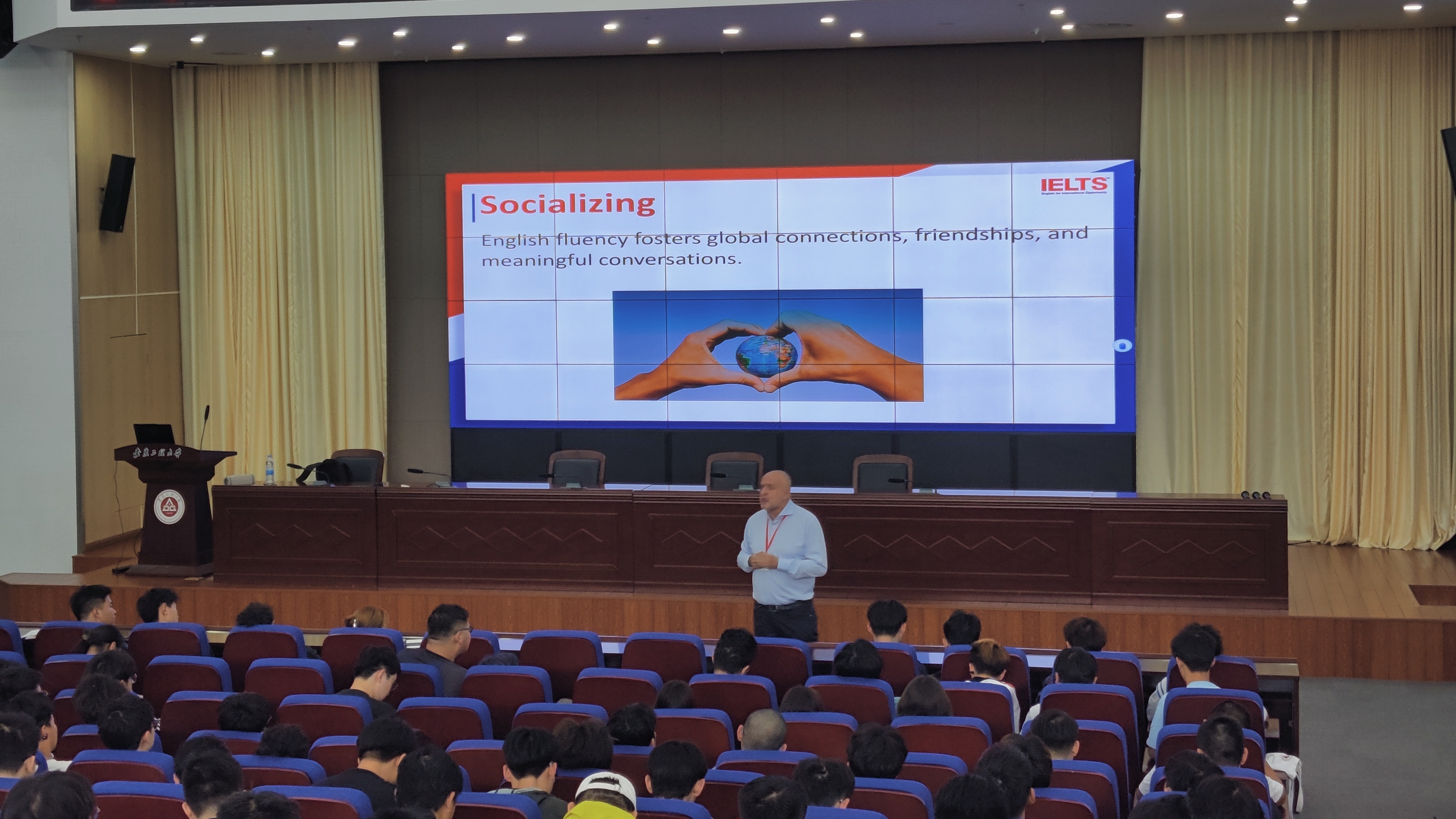 外教Gary老师以“英语在全球化背景下的影响力”为主题,通过互动游戏(如“猜国际明星童年照”、“肢体语言猜词”)活跃课堂氛围,强调英语不仅是学术工具,更是职场竞争力的核心要素。他鼓励学生以趣味化方式提升语言能力,打破对英语学习的刻板印象。