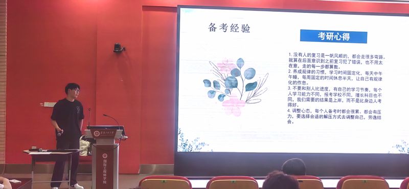 为助力22级电子专业学生明确考研方向、掌握高效备考方法,提升考研成功率,512日下午4点,一场干货满满的电子专业考研经验分享会在梦溪报告厅顺利举行。本次分享会特别邀请了21级成功上岸的优秀学子作为主讲嘉宾,吸引了22级电子专业众多有考研意向的同学踊跃参与,现场气氛热烈分享会由电子系教师党支部书记王世芳主持。