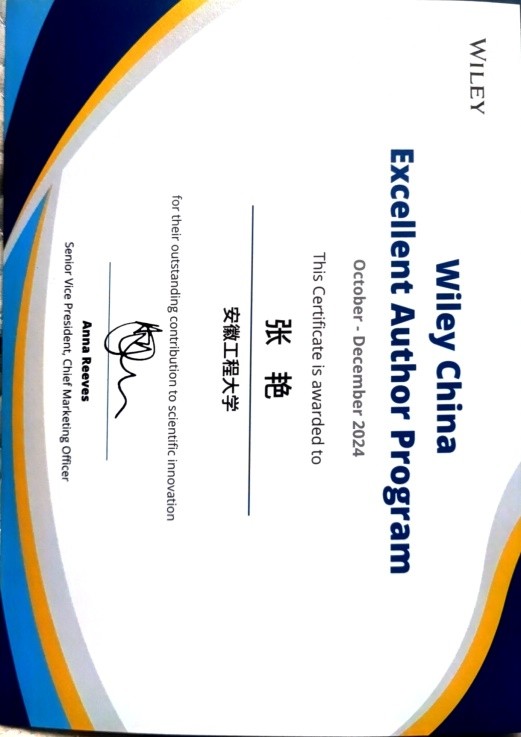 教师获得2024年第四季度“Wiley 威立中国高贡献作者奖”