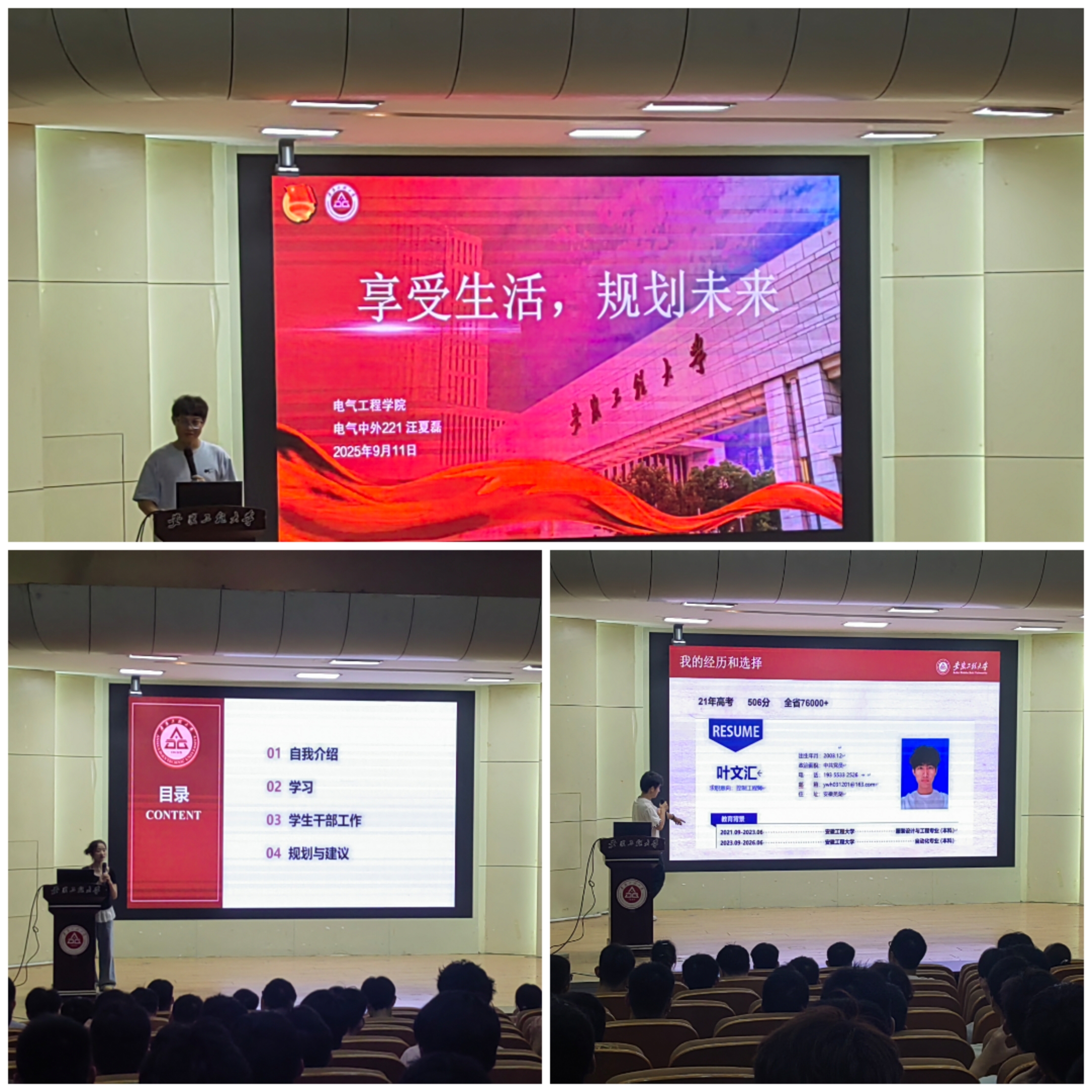 国家奖学金获得者、自动化222 班叶文汇结合自己转专业的经历分享,指出大学是成长关键阶段,要把握新方位,鼓励新生坚定自信、挑战自我,通过实践锻炼提升综合素质。校十佳大学生、电气工程(中外合作)221 班汪夏磊围绕学科竞赛这一主题分享了宝贵经验。他激励同学们要保持积极探索的精神,以坚韧不拔的毅力面对竞赛中的困难与挑战,既要敢于吃苦,更要能够吃苦,在竞赛的征程中不断突破自我,收获成长与进步。校魅力团支书、电气工程 222 班张娜娜结合自己在班级和学院团委的任职经历,生动地分享了如何充分利用班级和学院搭建的广阔平台,锻炼自己、提升自己,实现个人的全面发展。